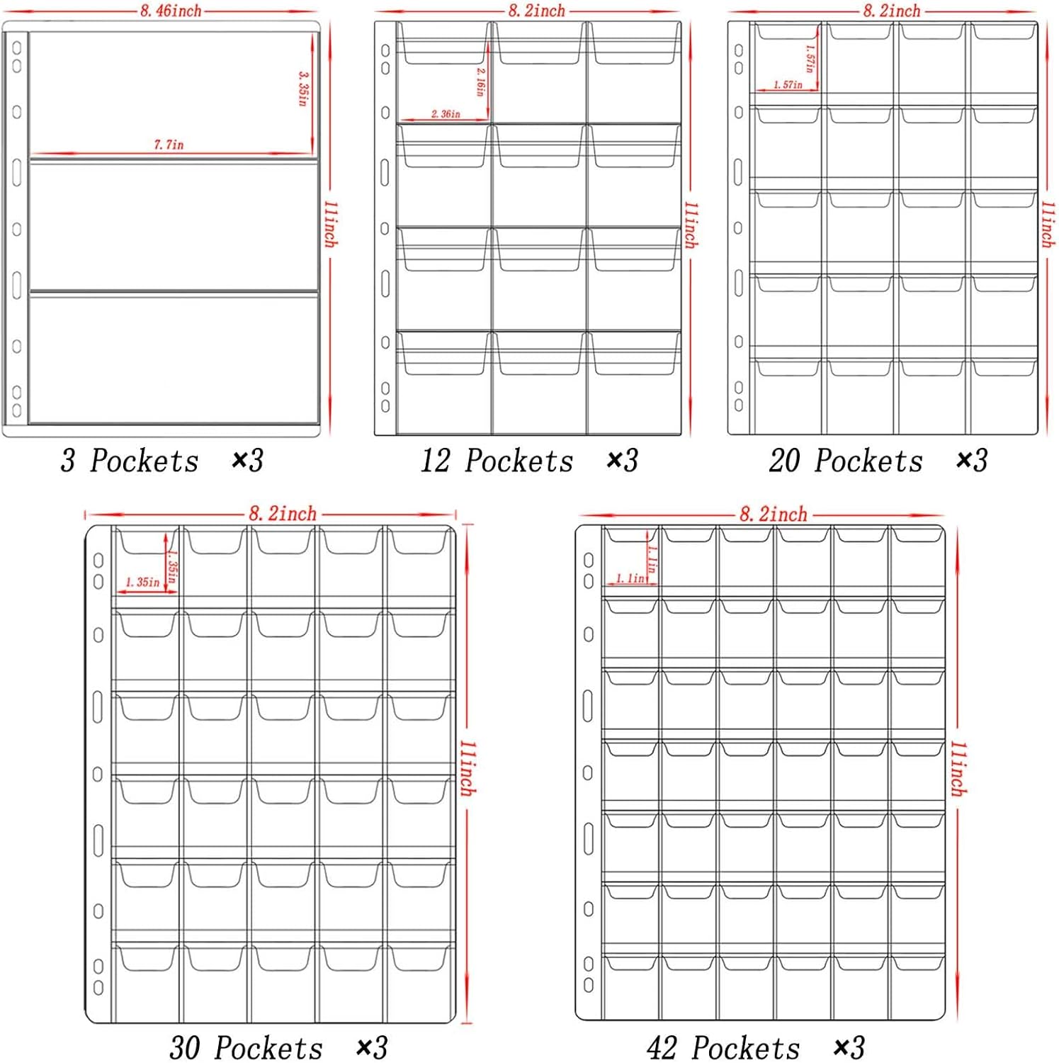 - 321 Pockets Coin Collection album: The size of coin collection album: 13'' x 10.5'' x 2.5''. It can hold 312 coins and 9 paper currency, 12 sheets coin collection pages and 3 sheets currency pages; Includes 5 pocket styles(Each pocket style has 3 sheets)