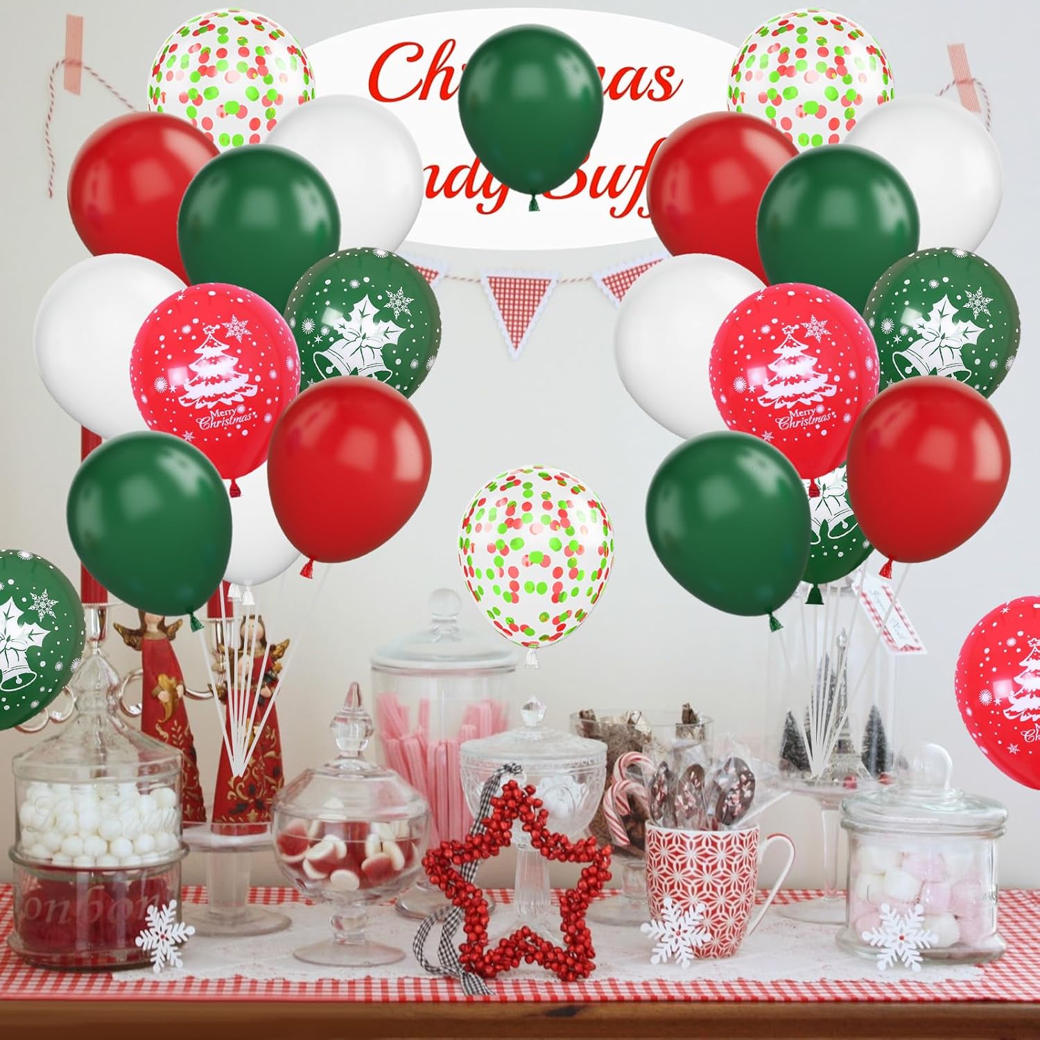 Christmas Balloons, 12 Inch Green Red White Xmax Balloons with Deer Christmas Tree Printed Balloons Red Green Confetti Balloons for Christmas Party Baby Shower Birthday Decorations Supplies