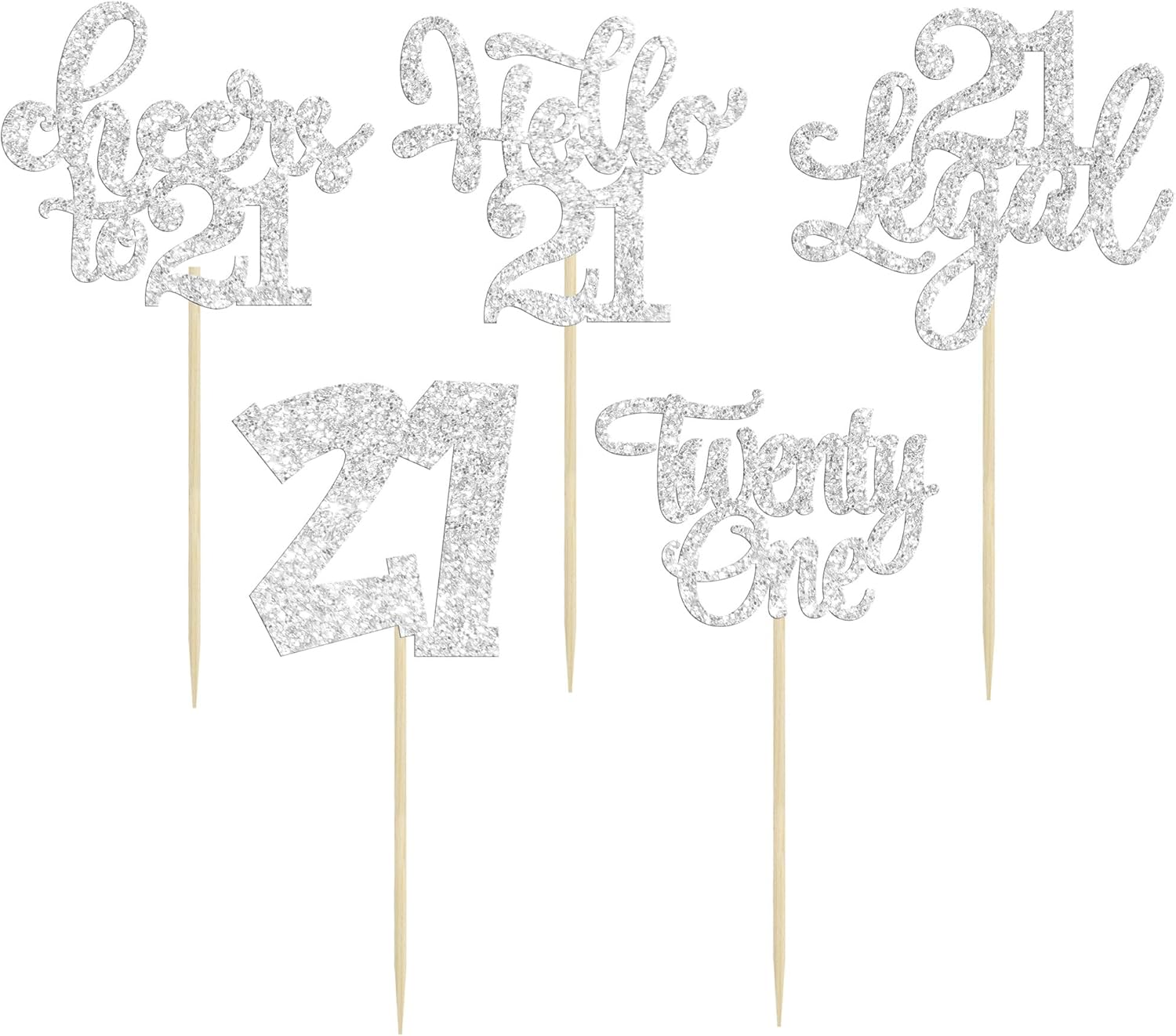 30pcs 21st Birthday Cupcake Toppers - Twenty One Legal 21st Cupcake Picks - Cheers to 21 Years Old - Silver Glitter Cake Decorations