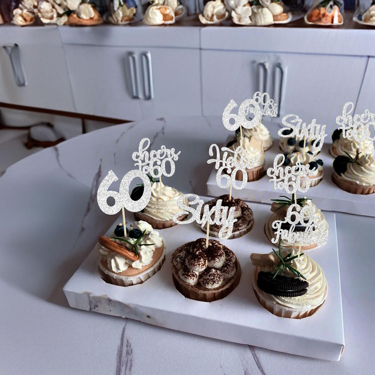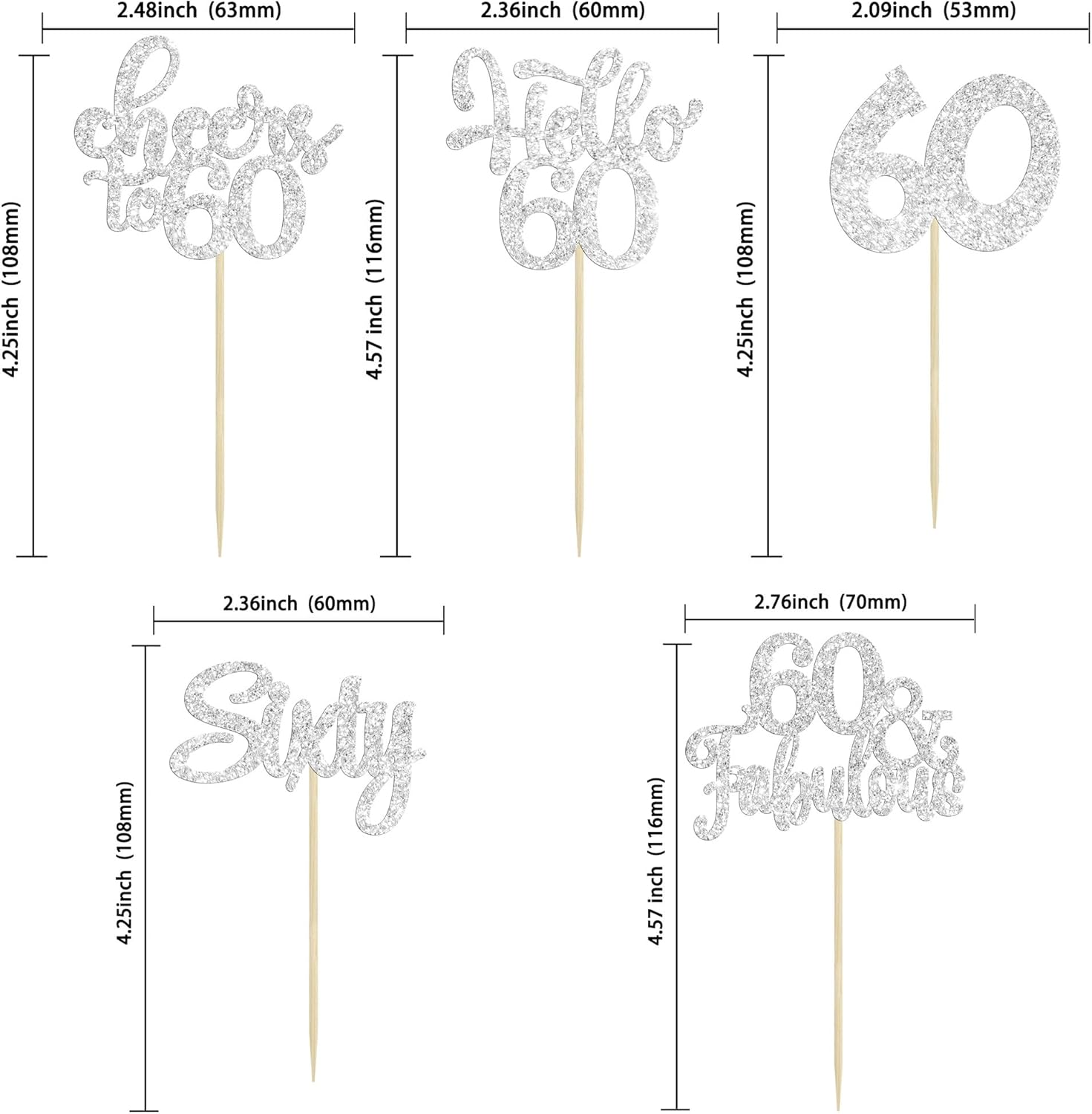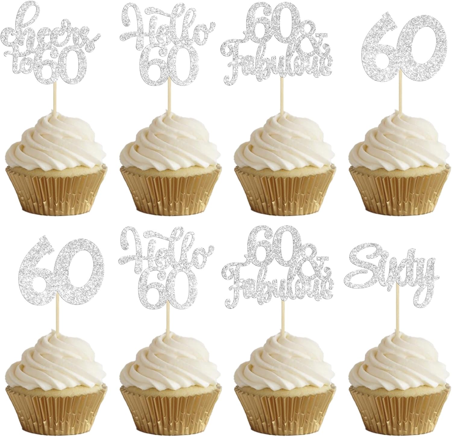 - -These Happy 60th Birthday Cupcake Toppers are so cute and good for happy 60th birthday theme party, cheers to 60 years theme party, 60 fabulous theme party, happy 60th birthday anniversary theme party cake decorations. They can make your cupcake more attractive and bring the fun to your party. You can also apply them for ice cream, fruits, cookies and other desserts.