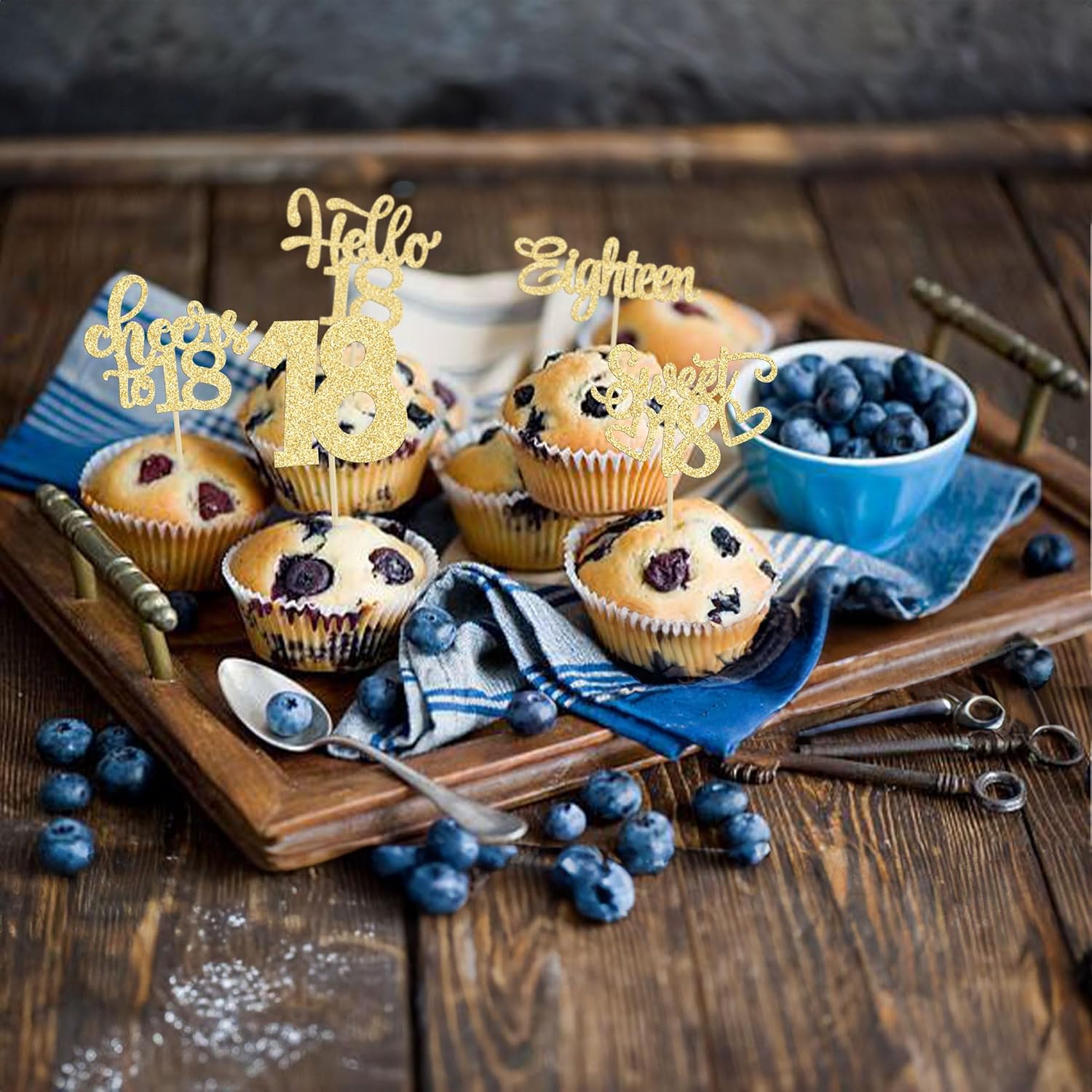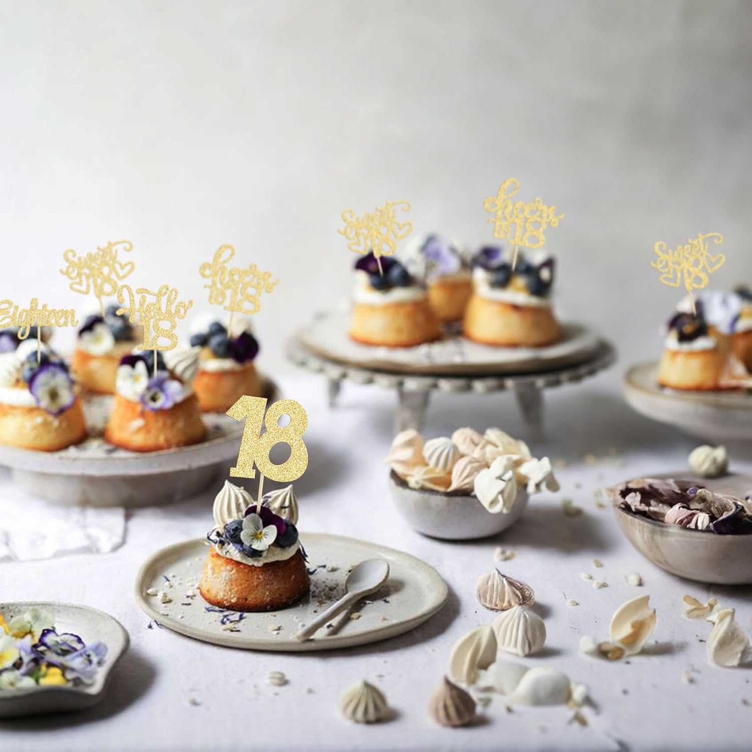 30Pcs18th Birthday Cupcake Toppers Eighteen Happy 18th Cupcake Picks Sweet 18 Cheers to 18 Cake Decorations for 18th Birthday Anniversary Party Supplies Gold Glitter