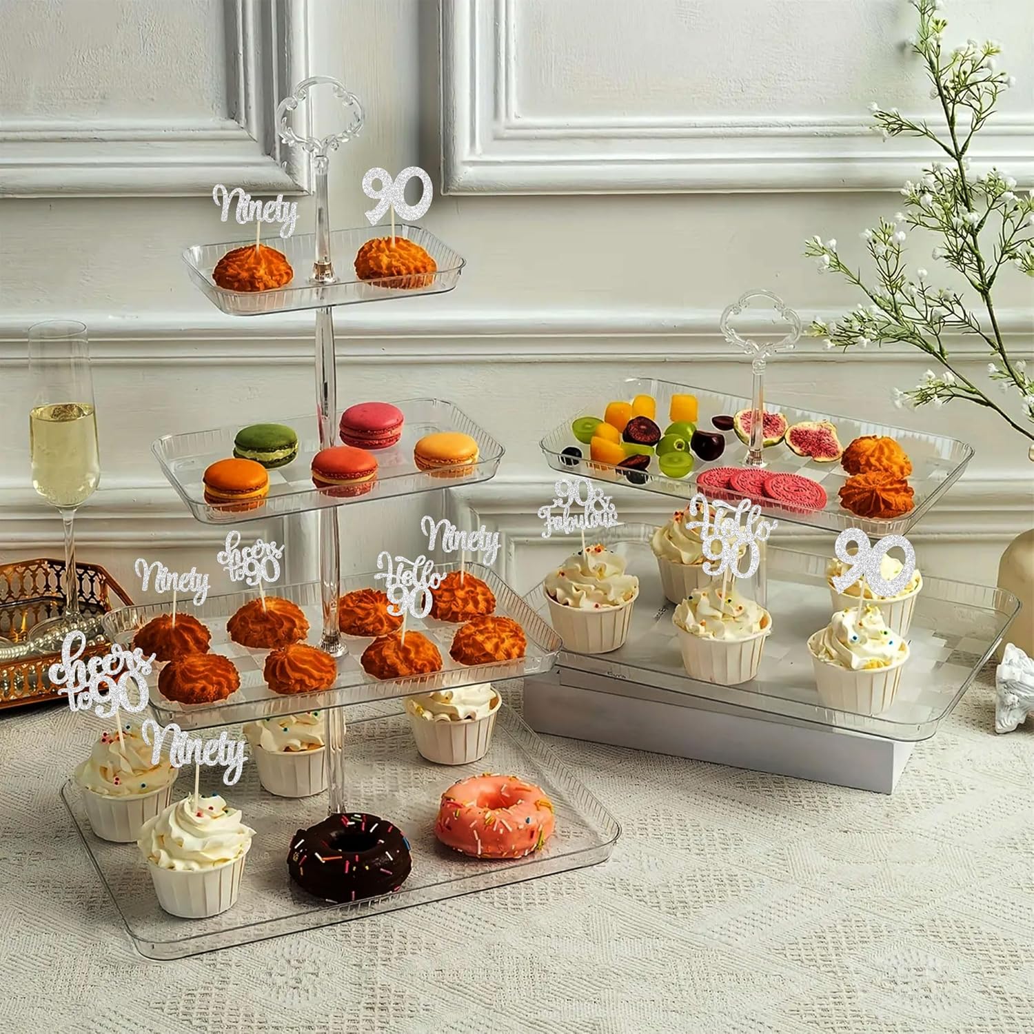 30pcs Happy 90th Birthday Cupcake Toppers - Silver Glitter Ninety Cheers to 90 Years Old Cupcake Picks for Anniversary Party Cake Decorations