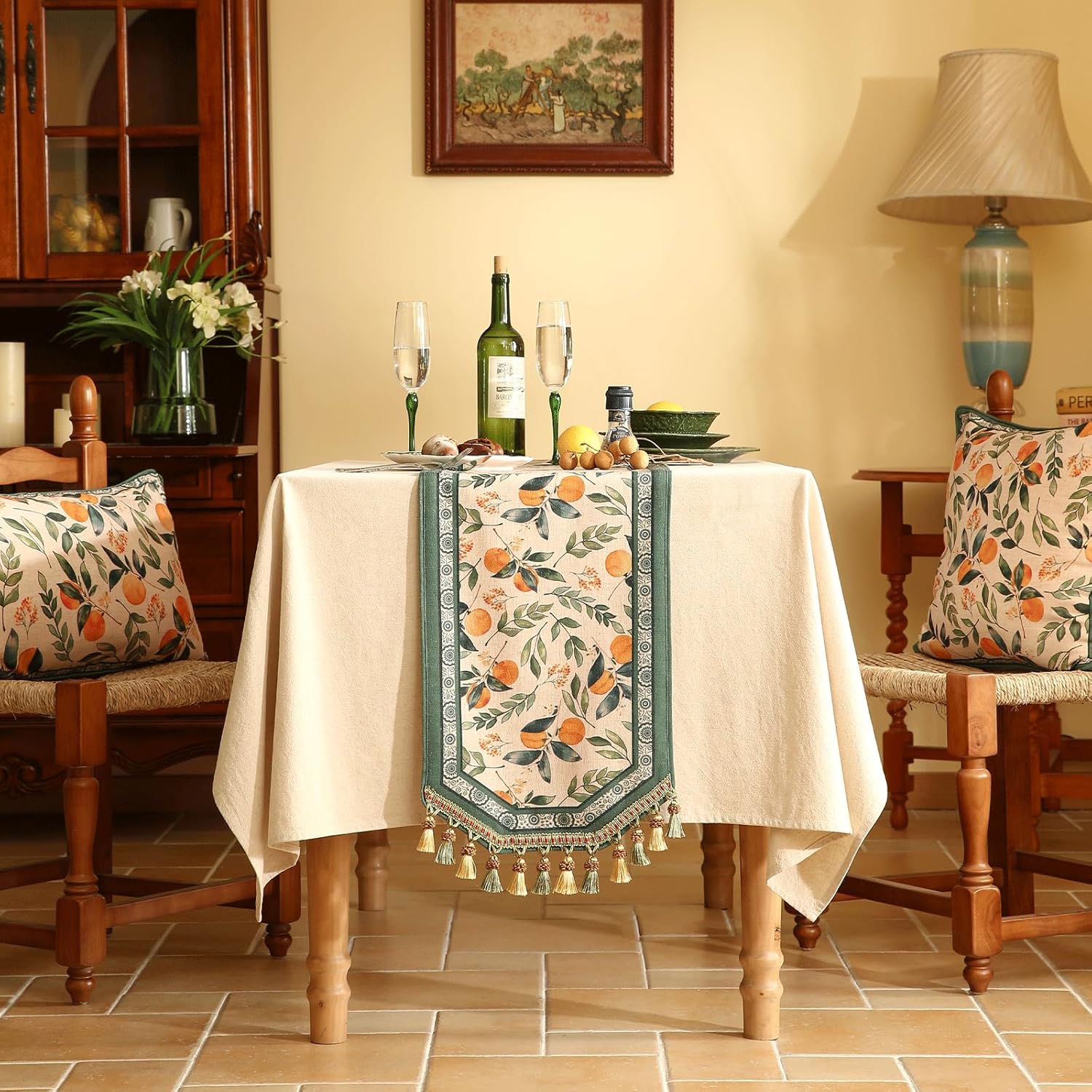 patdrea Designer Vintage Fresh Farmhouse Linen Table Runner 87 Inch Long, Green and Orange Pattern Table Mat, Decor for Kitchen Dining Table Coffee Table Shelf Cabinet Banquet Christmas ,12"*87"