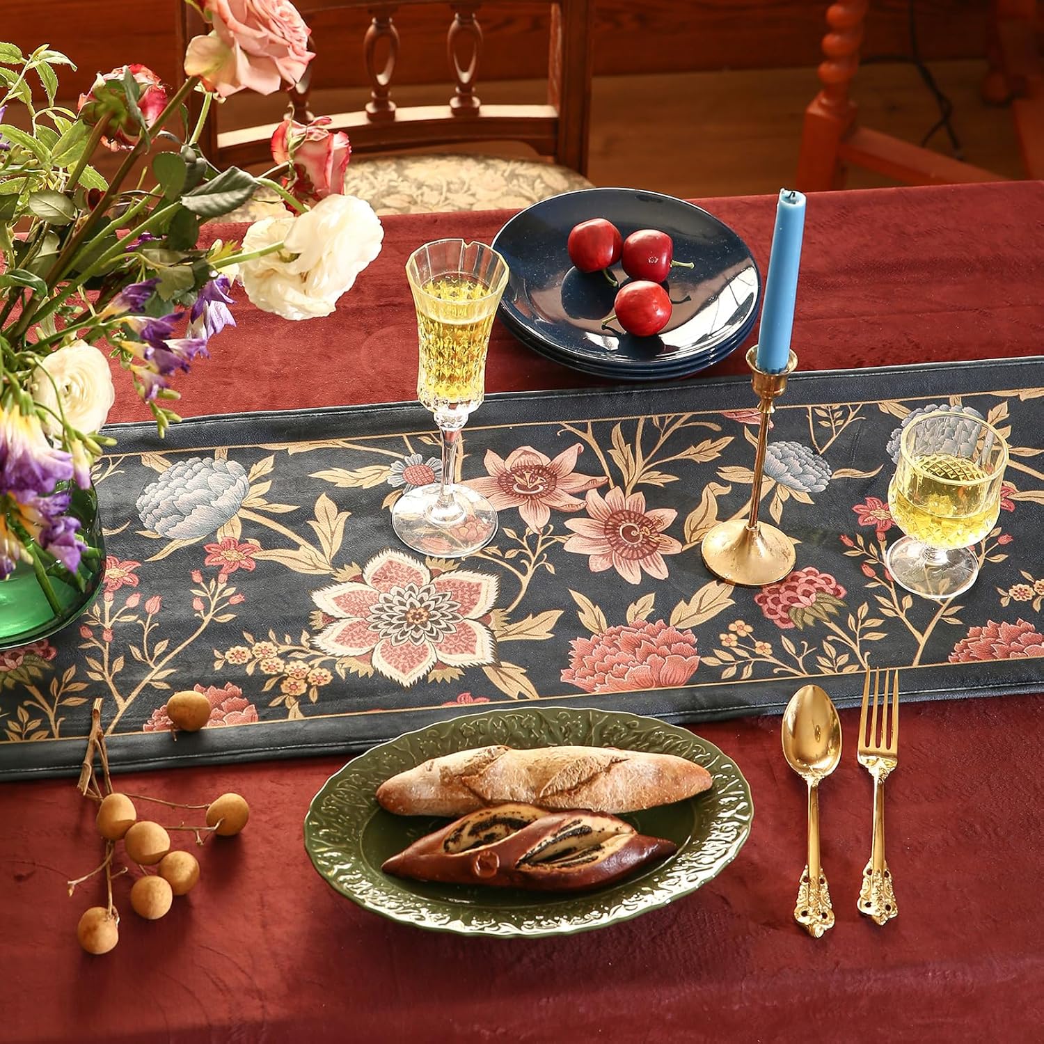 patdrea Designer Vintage Black Floral Velvet Table Runner 102 Inch Long, Pink Khaki Bouquets Pattern Table Mat, Decoration for Kitchen Dining Coffee Table Cabinet Banquet Thanksgiving,12"*102"