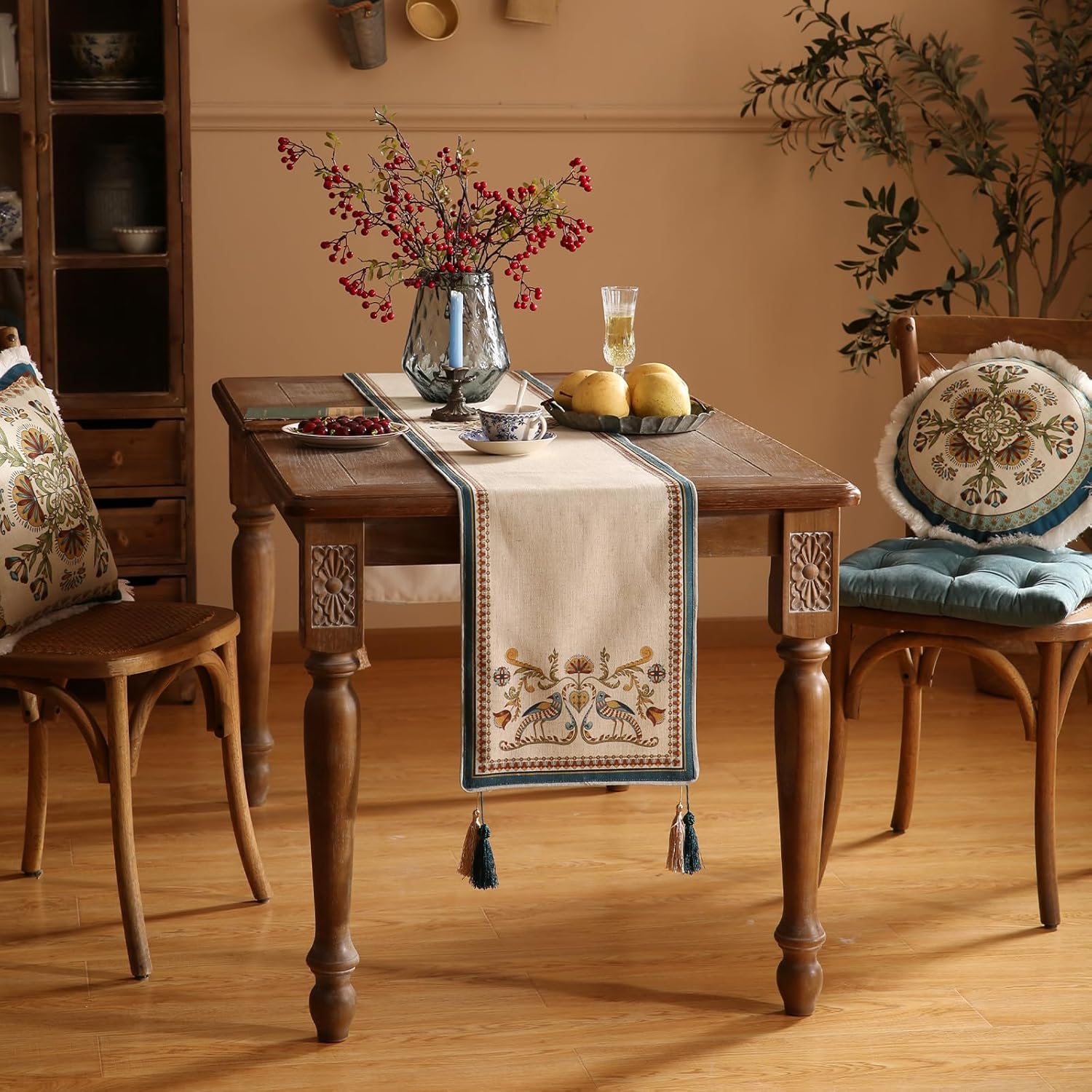 - Care Instructions: Table runners with tassels, pendants, or other decorations should only be washed by hand and placed in a cool, well-ventilated area to dry after washing. For other models without decorations, they can be washed in a gentle cycle in the washing machine or by hand, tumble dried on low heat, and ironed if needed. Please avoid using bleach.