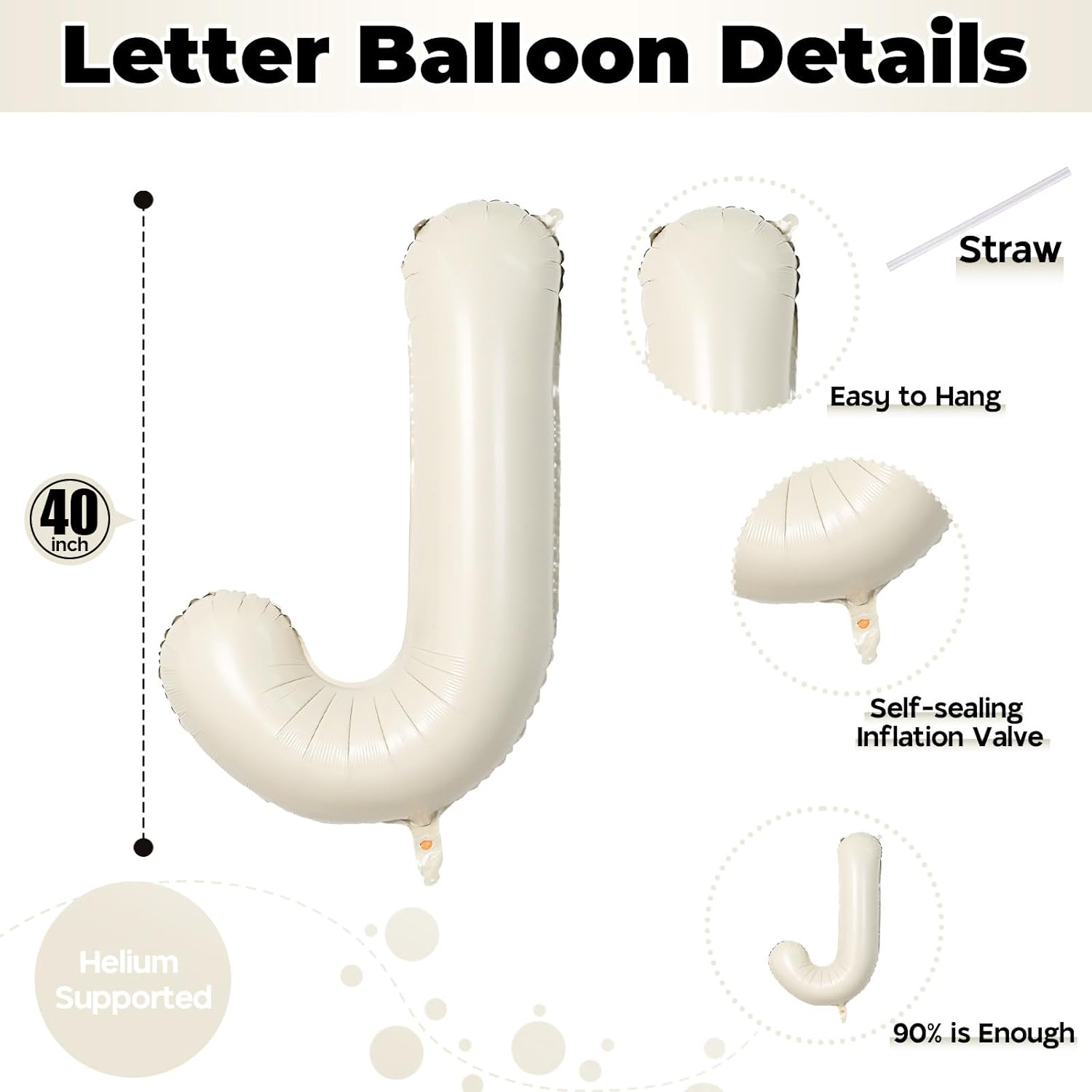 - π What You Get: Our product package includes 1pcs 40 inch "J" letter foil cream white balloon and 1pcs convenient straw for inflate. You can choose any big letter balloons to combine and customize the word you want to form. Make your party more unique and meaningful.