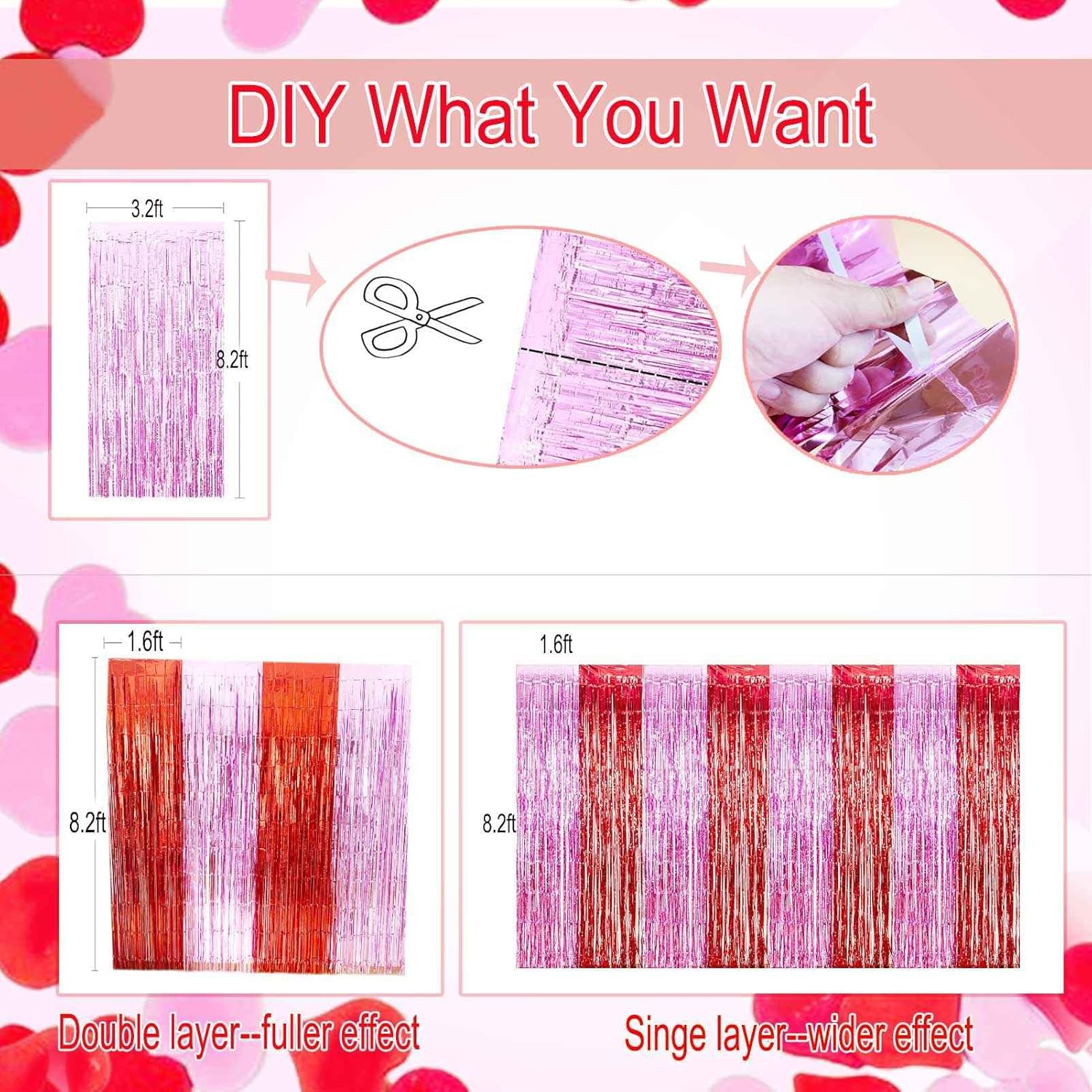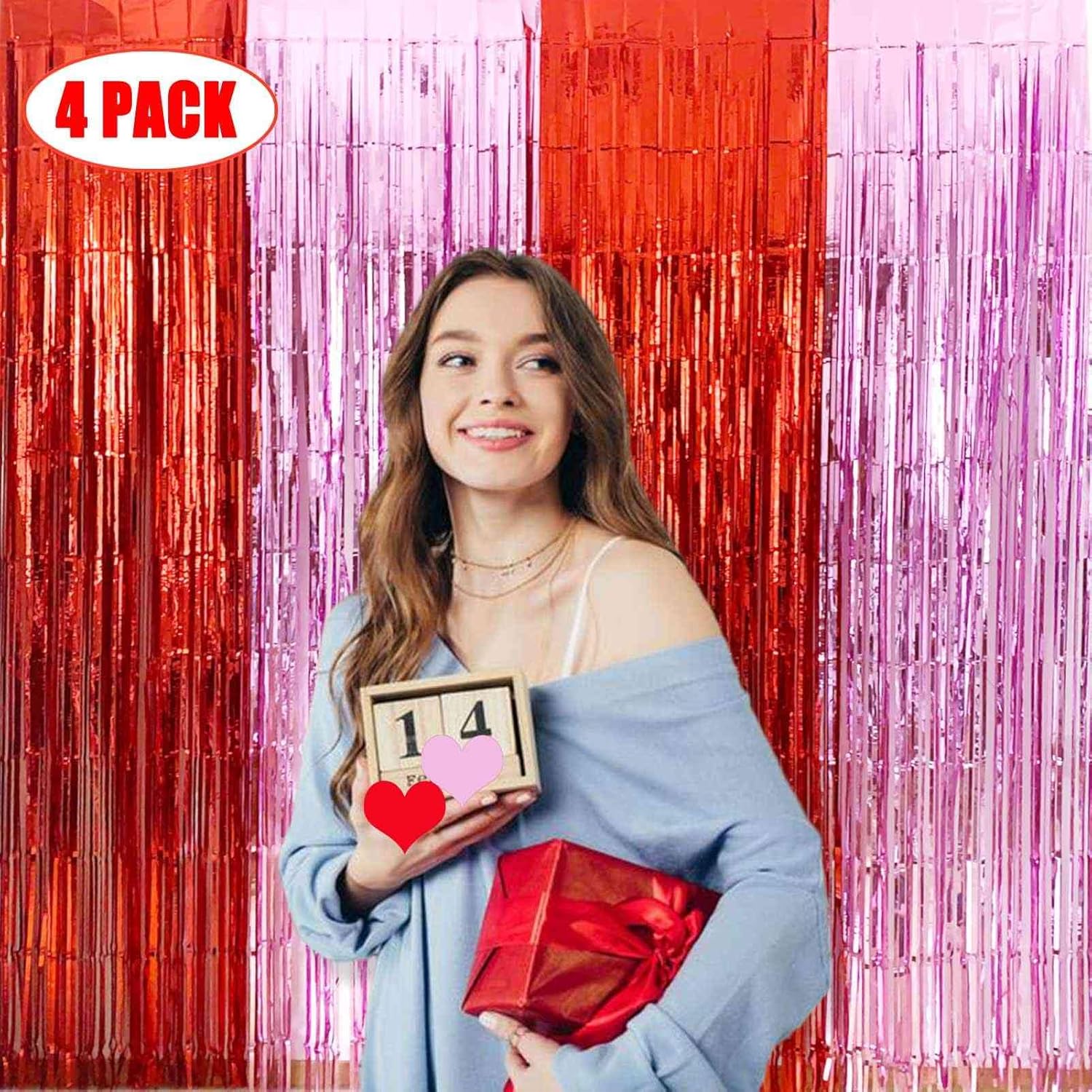 - RED PINK METALLIC TINSEL FOIL FRINGE CURTAINS: The package includes 4packs foil fringe backdrop curtains(2pack red +2pack pink), each metallic tinsel curtain is 3.2ft(wide)×8.2ft(drop), wonderful accessories for decorating doorway, window and walls. This stunning foil fringe curtain has a metallic finish that will add a touch of glamour to Valentine's Day party backdrop