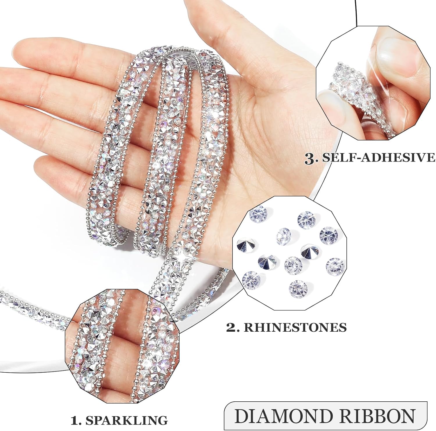 - Silver AB Rhinestone Ribbon: 1 roll of self-adhesive rhinestone ribbon Sticker, approx 3 yards in length, 1cm/0.4inch in width. (PACKAGE CONTENT)