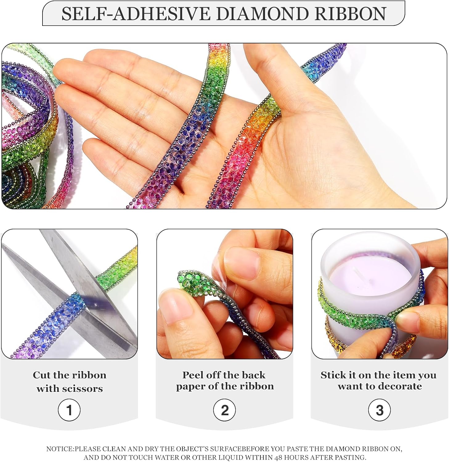 - Self-Adhesive Diamond Ribbon: The self-adhesive design with backing glue makes it possible to stick anywhere as long as the surface is smooth and clean. You cut the rhinestone ribbon into different lengths with scissors, then peel off the back paper of the sticker and paste it on the project you want to decorate.