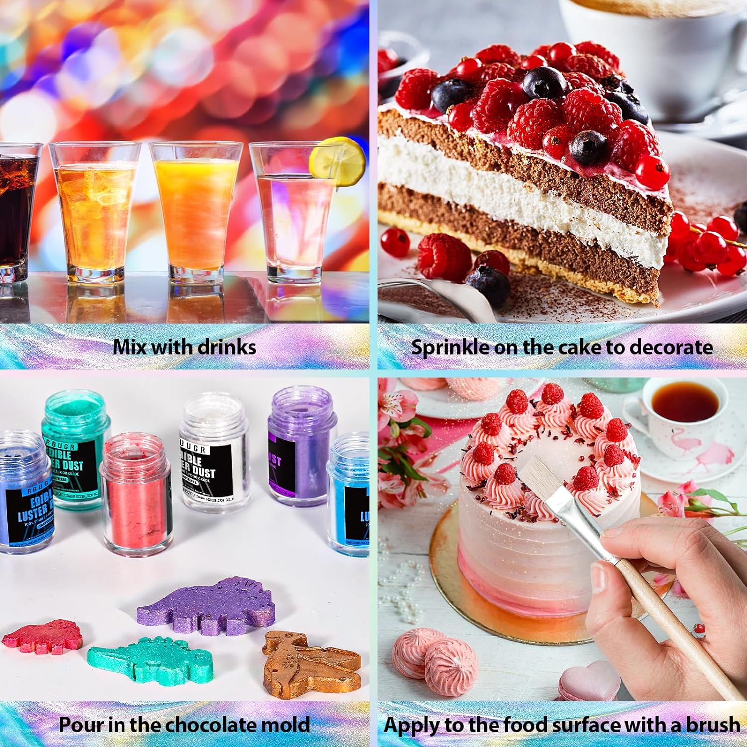 - Various Ways of Use: You can mix the luster dust directly with vodka, cocktails and other beverages to make sparkling starlight drinks; you can dip a brush into the pigment powder and apply it evenly on candy popsicles to make lovely patterns; you can apply the edible glitter directly on chocolate grinders to make dazzling chocolates; and you can sprinkle the glitter drink on cupcakes to make beautiful cakes in all colours, etc