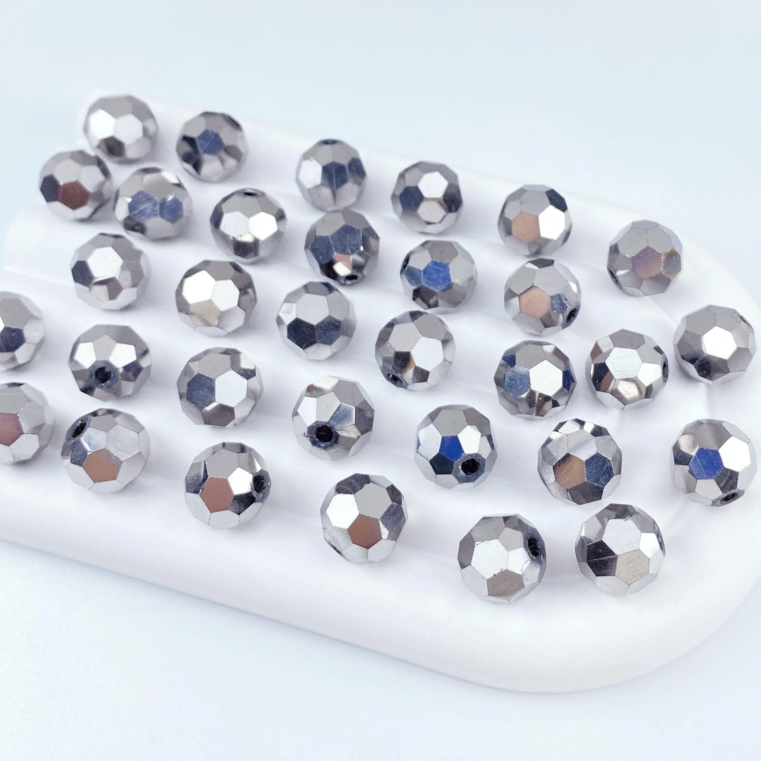 50 PCS 10mm Crystal Glass Beads Round Multiple Faceted Loose Spacer Glass Beads for DIY Handcrafte Bracelet Necklace Earring Jewelry Making(Silver)