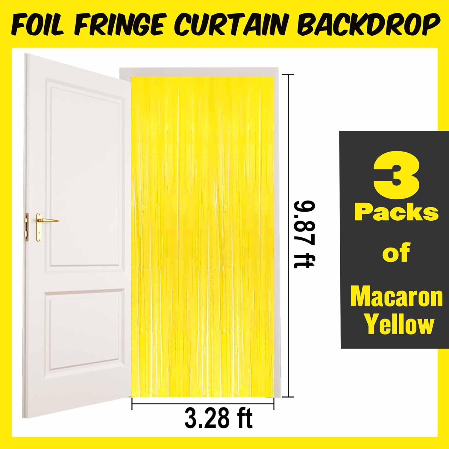 3 Pack Macaron Yellow Foil Fringe Curtains Backdrop, 3.28 x 9.8 Ft Metallic Streamers Tinsel Curtains Background for Photo Booth, Birthday, Halloween, Christmas, New Year Party Decorations