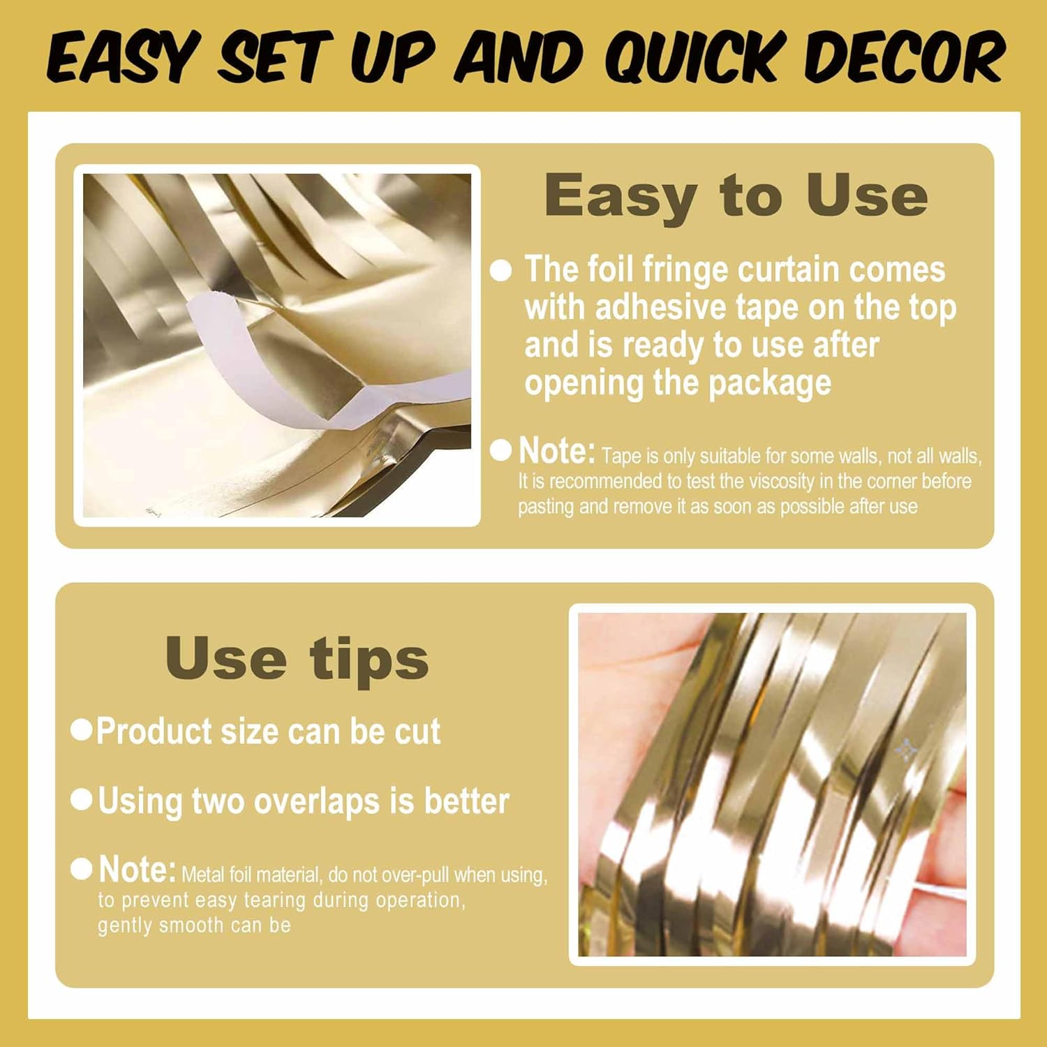 - Easy to Use: The tinsel foil fringe streamers curtain backdrop comes with double sided tape on the top, gently peel plastic strip off and it would be very easy to paste on smooth surfaces such as wall, window, table, door or anywhere you like