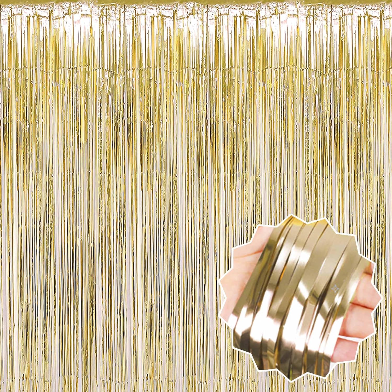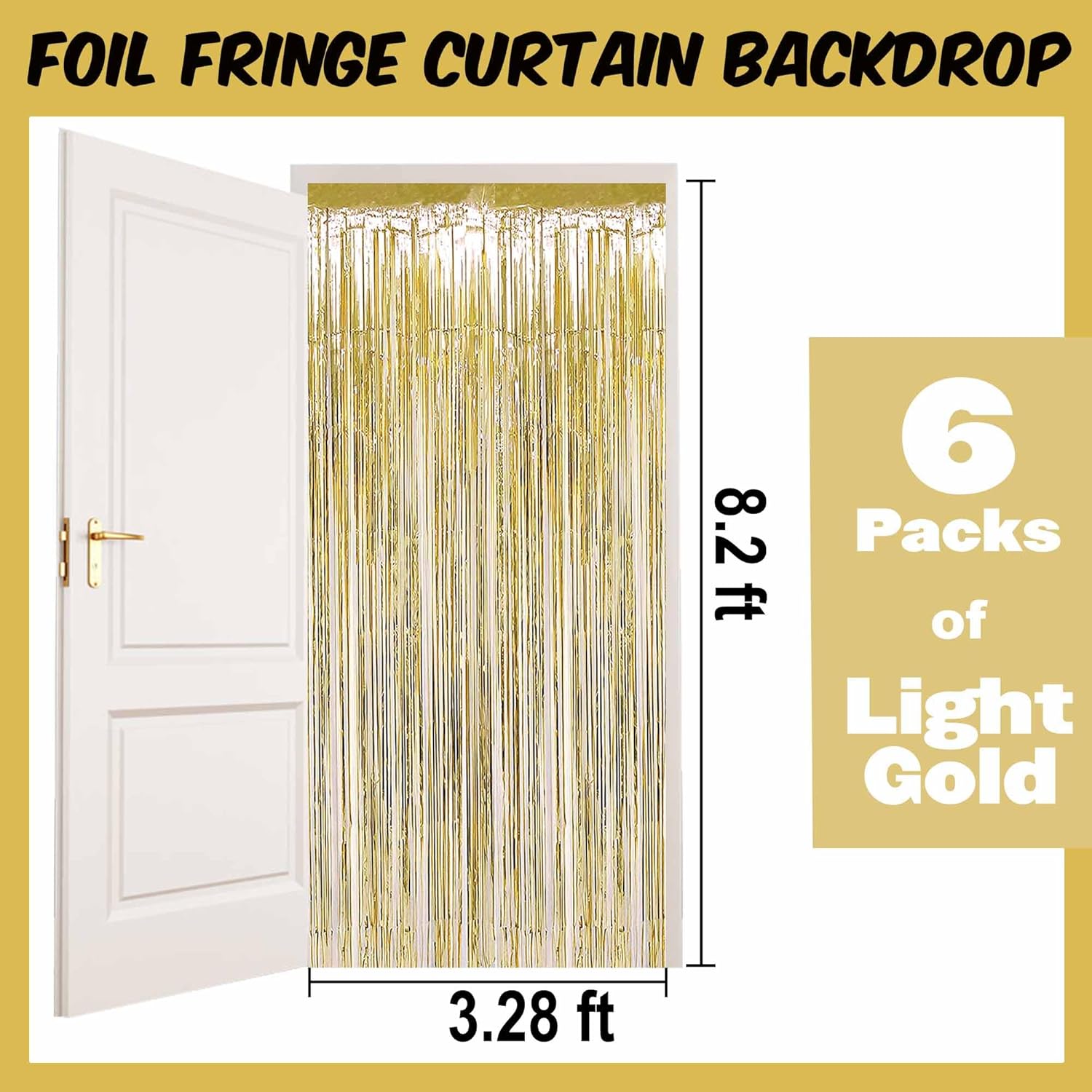 - Package and size: 6 Packs Foil Fringe Streamers Curtain Backdrop. The size is 3.28 x 8.2 feet. It's long, enough to fit any party occasion. Made of metallic foil material, shiny and creating dazzling effects, adding luxury and visual impact to the party