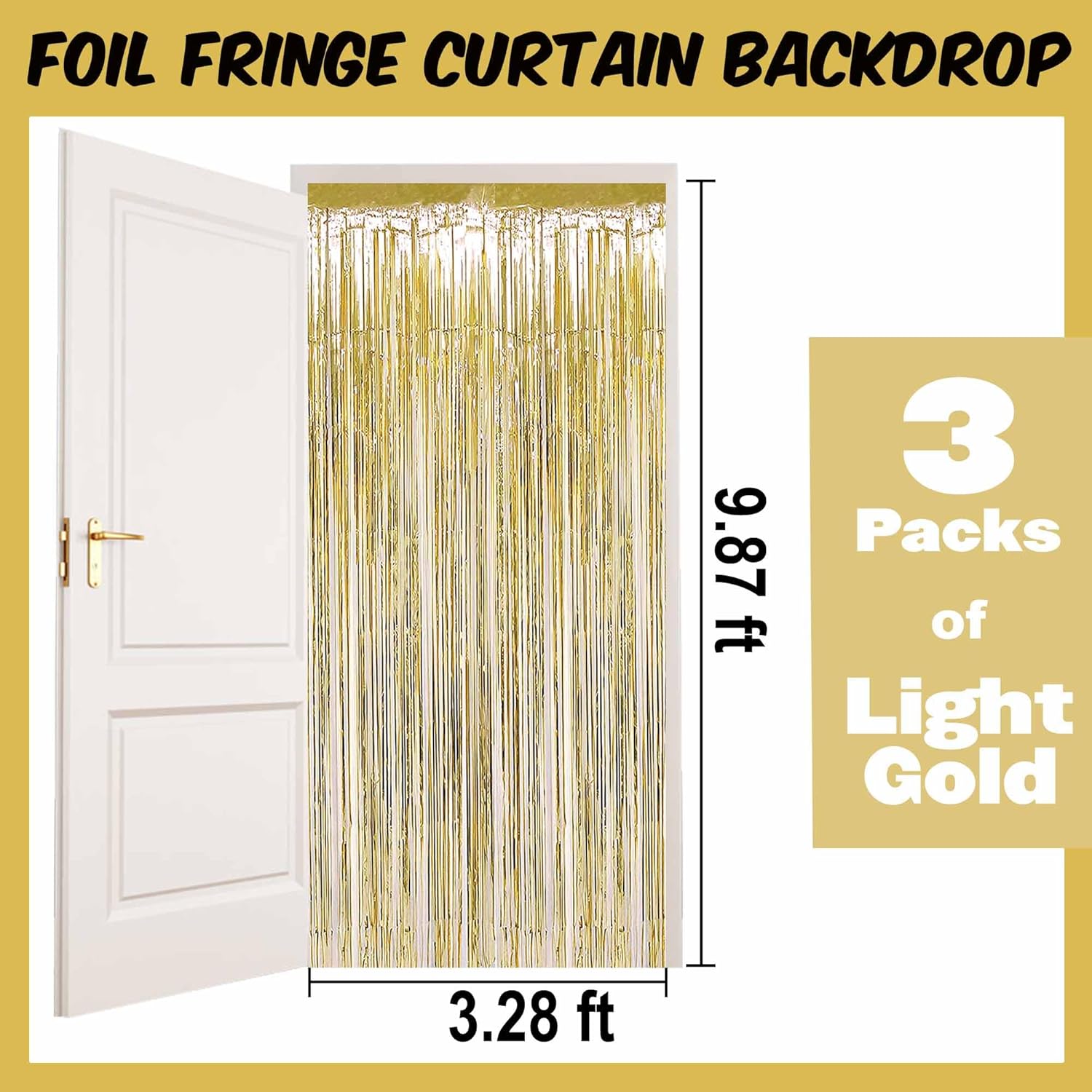 - Package and size: 3 Packs Foil Fringe Streamers Curtain Backdrop. The size is 3.28 x 9.8 feet. It's long, enough to fit any party occasion. Made of metallic foil material, shiny and creating dazzling effects, adding luxury and visual impact to the party