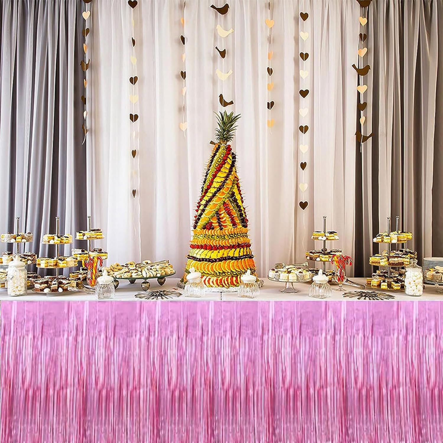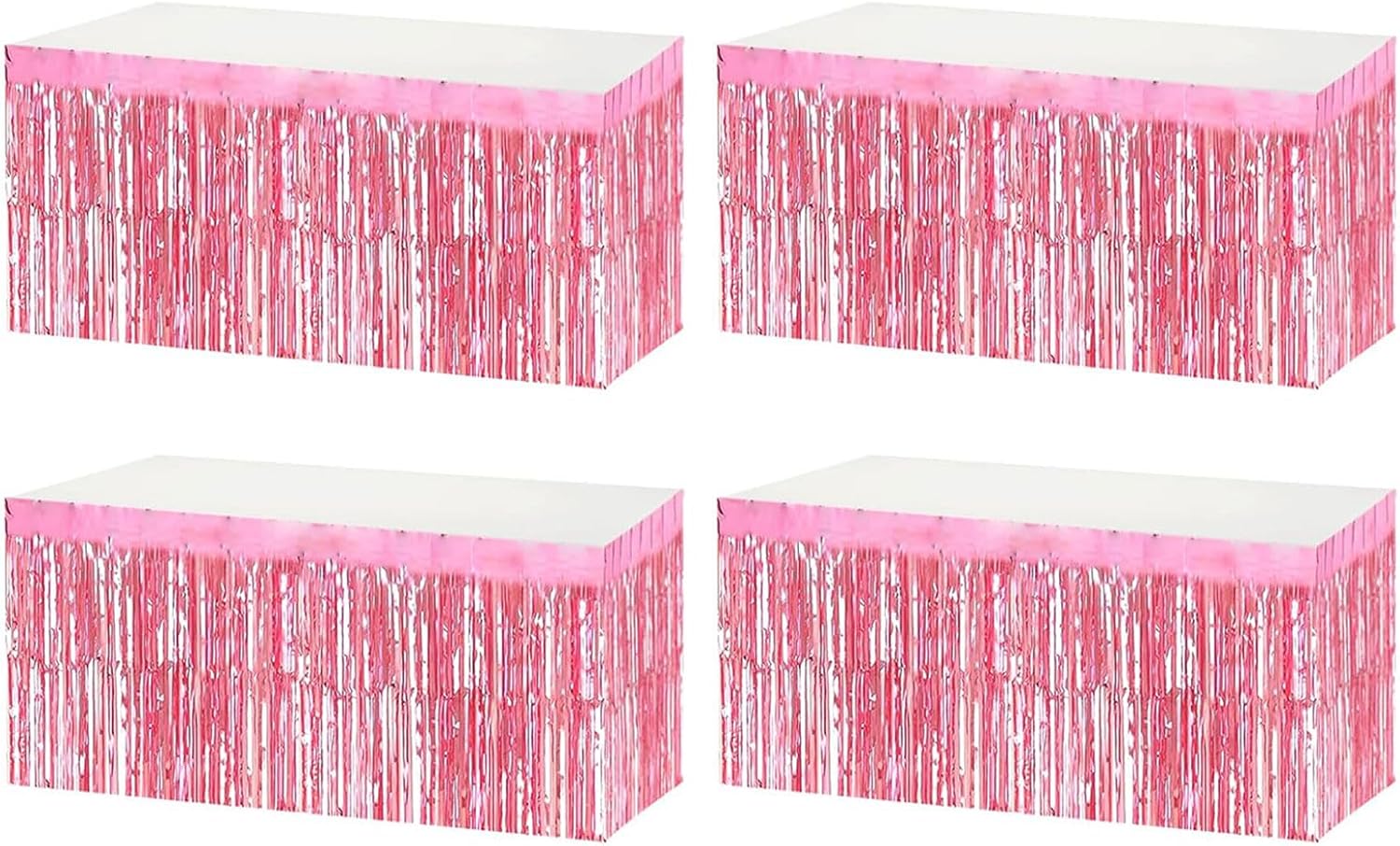 4 Pack Metallic Foil Fringe Tinsel Table Skirts,29x108 Inch Party Disposable Table Skirt Banner for Hotel Banquet Parade Floats Mardi Gras Holiday Birthday Wedding New Year Party Decoration(Pink)