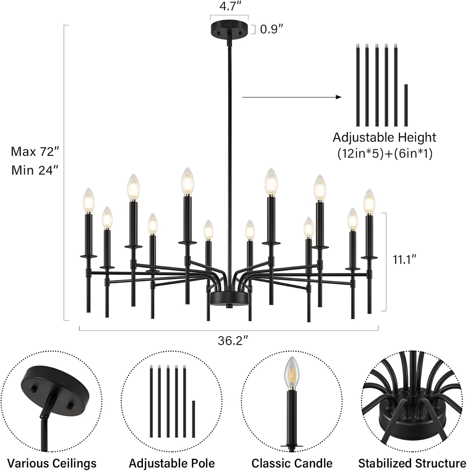 - Dimmable and E12 Bulb Compatibility: With 12 E12 candelabra sockets, this black chandelier is compatible with various E12 bulbs (incandescent, LED, CFL, and halogen, 40W MAX / bulb), offering dimmable functionality to create the perfect ambiance. This black matte chandelier allows for flexible lighting control, making it suitable as a black chandeliers for dining room, or master bedroom chandelier (NOTE: bulbs and dimmer are NOT included)