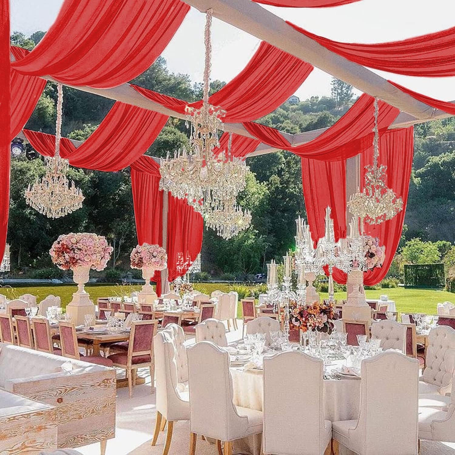 - âSize & Color - Ceiling Drapes for Weddings: Our red ceiling drapery contains 6 panels. Each panel is 5FT width x30FT length. Wedding arch drapes is long enough creating a great eye catching detail in wedding party events decor.