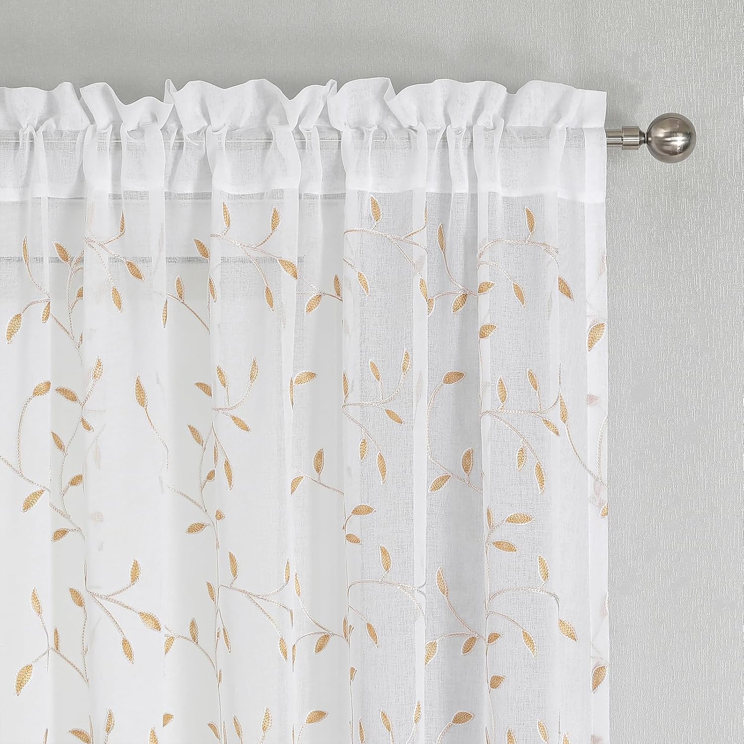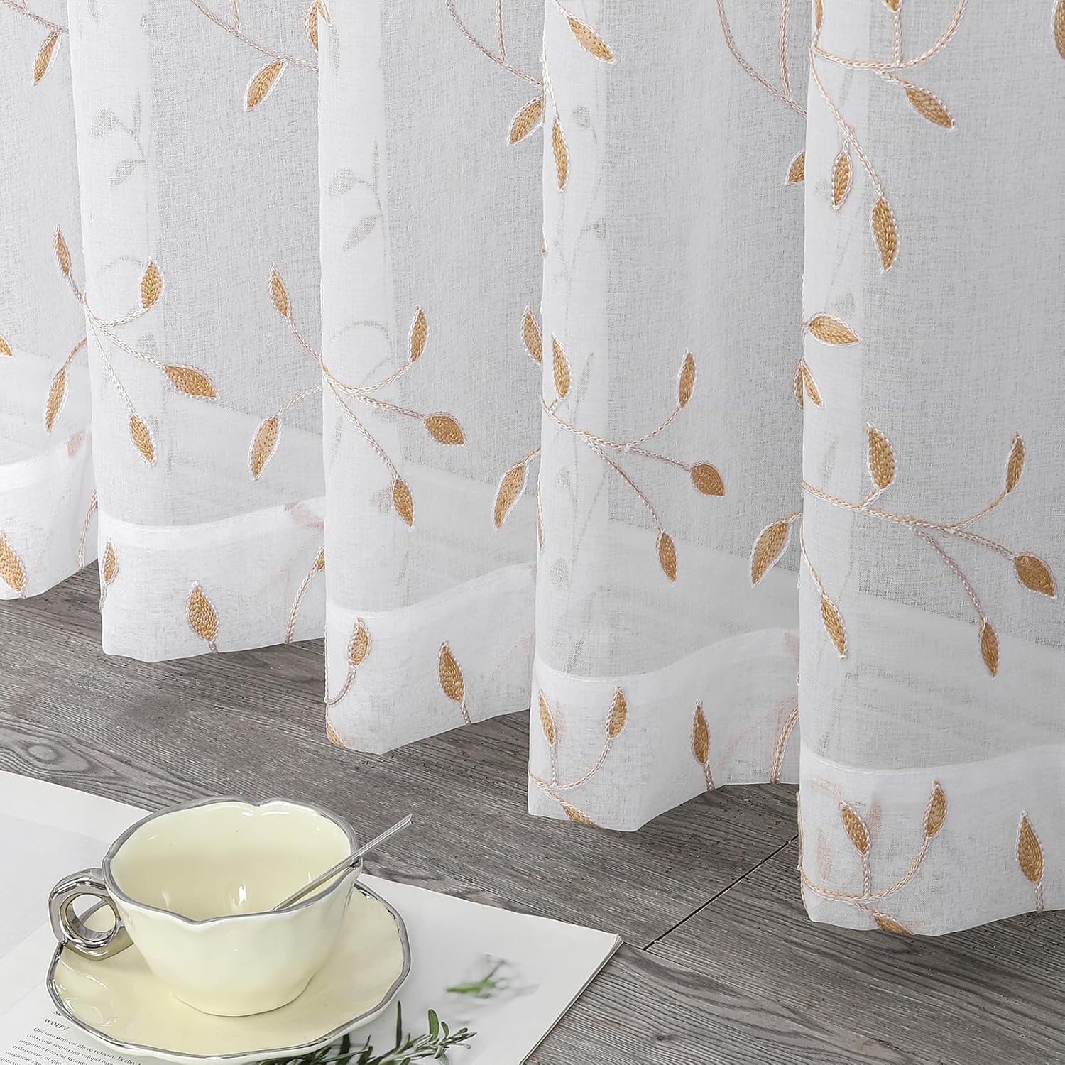 VISIONTEX White Sheer Voile Curtains, Decorative Orange Leaves Embroidery Faux Linen Rod Pocket Window Drapes for Home Kitchen, Living Room and Bedroom 54 x 95 Inch, Set of 2 Curtain Panels