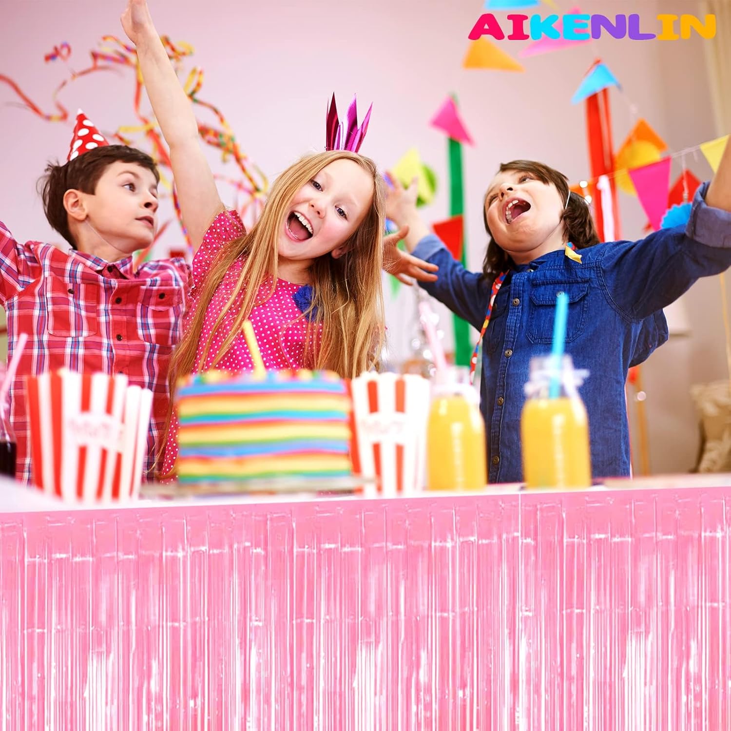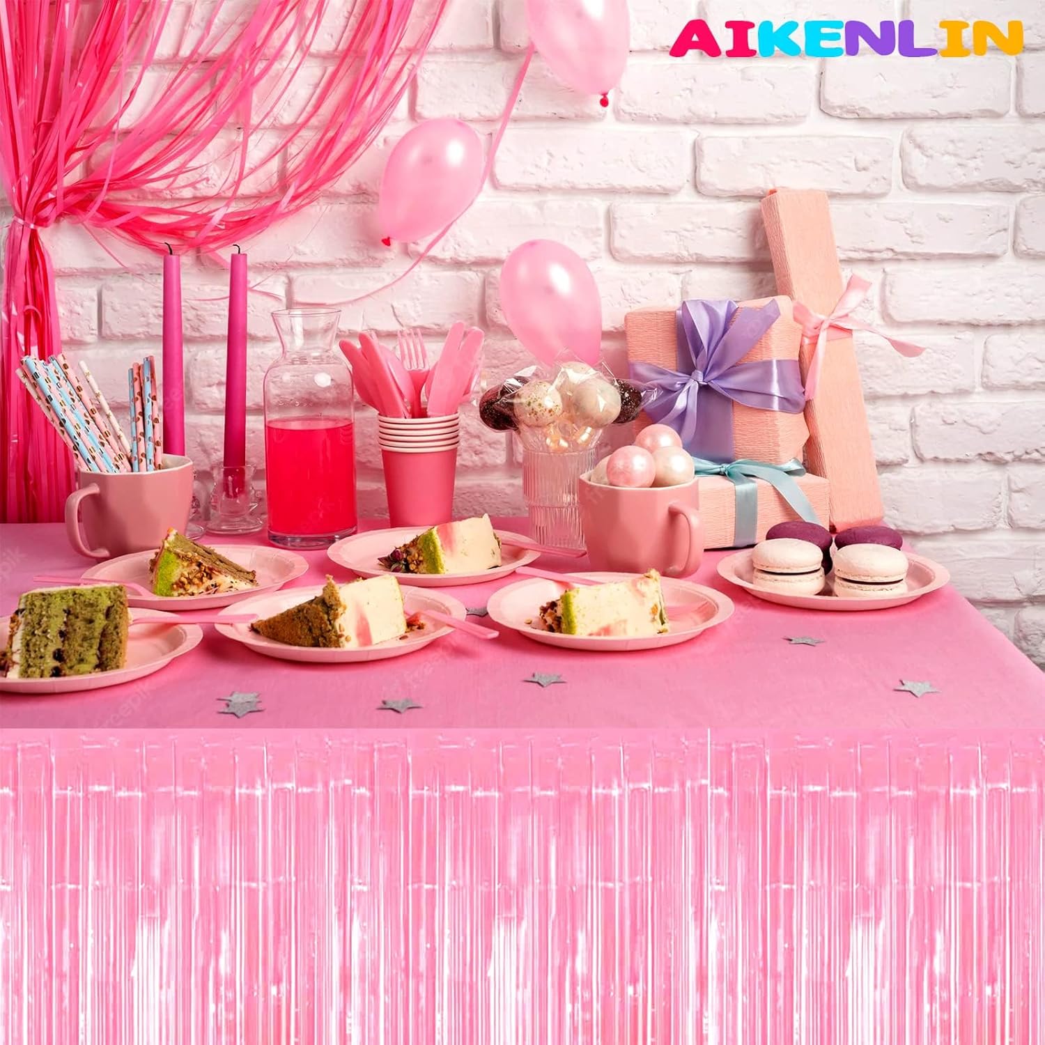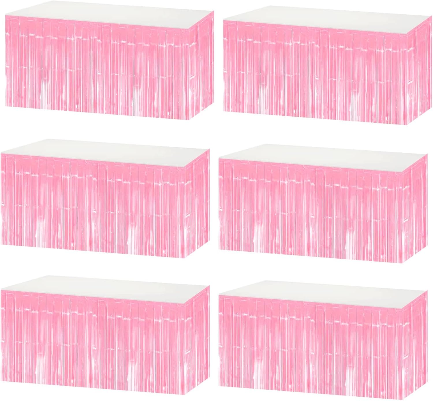 6 Pack 29x108 Inch Metallic Foil Fringe Tinsel Table Skirts Banner for Rectangle Tables Streamer Garland Curtains Backdrop for Birthday, Parade Floats, Valentine's Day Party Decoration(Macaron Pink)