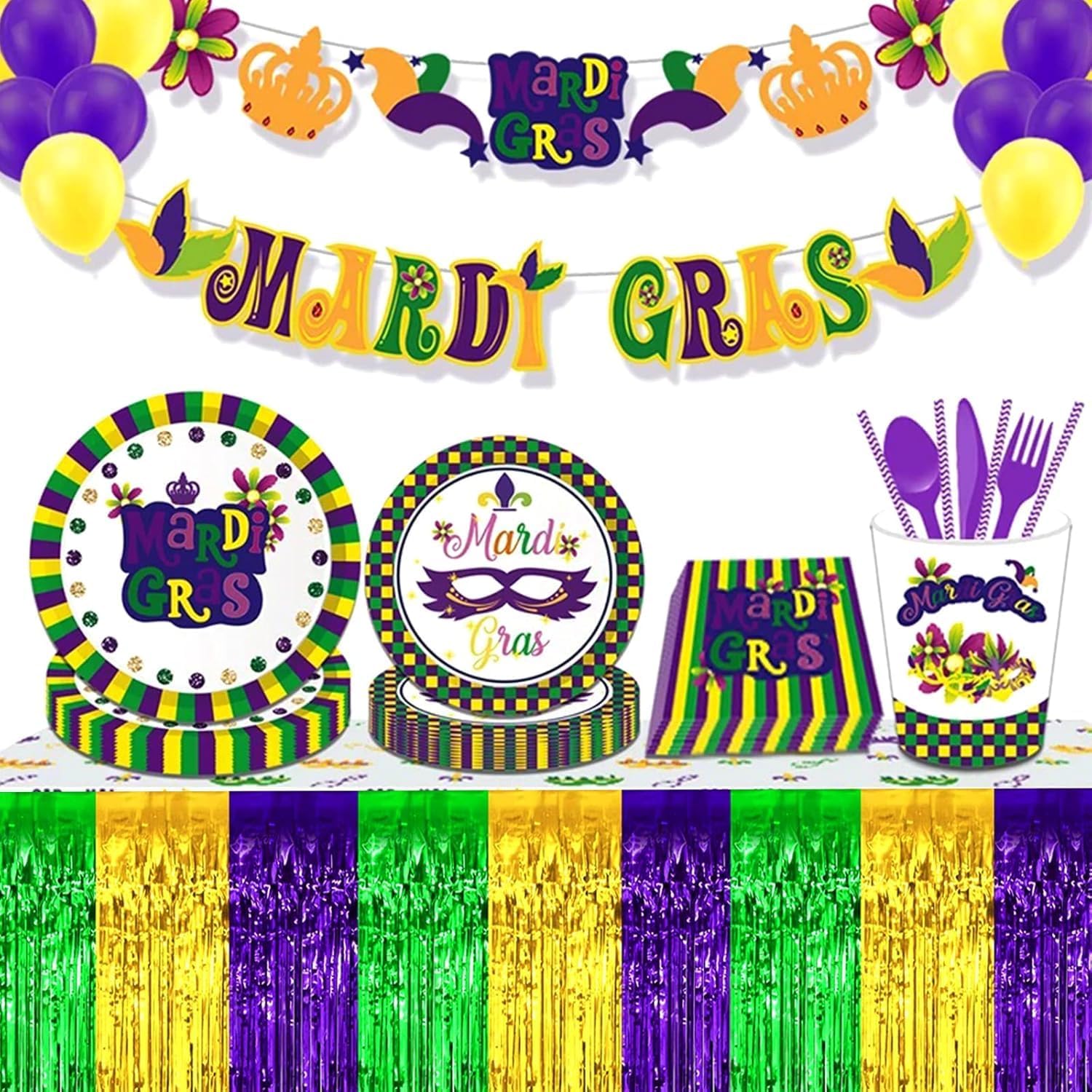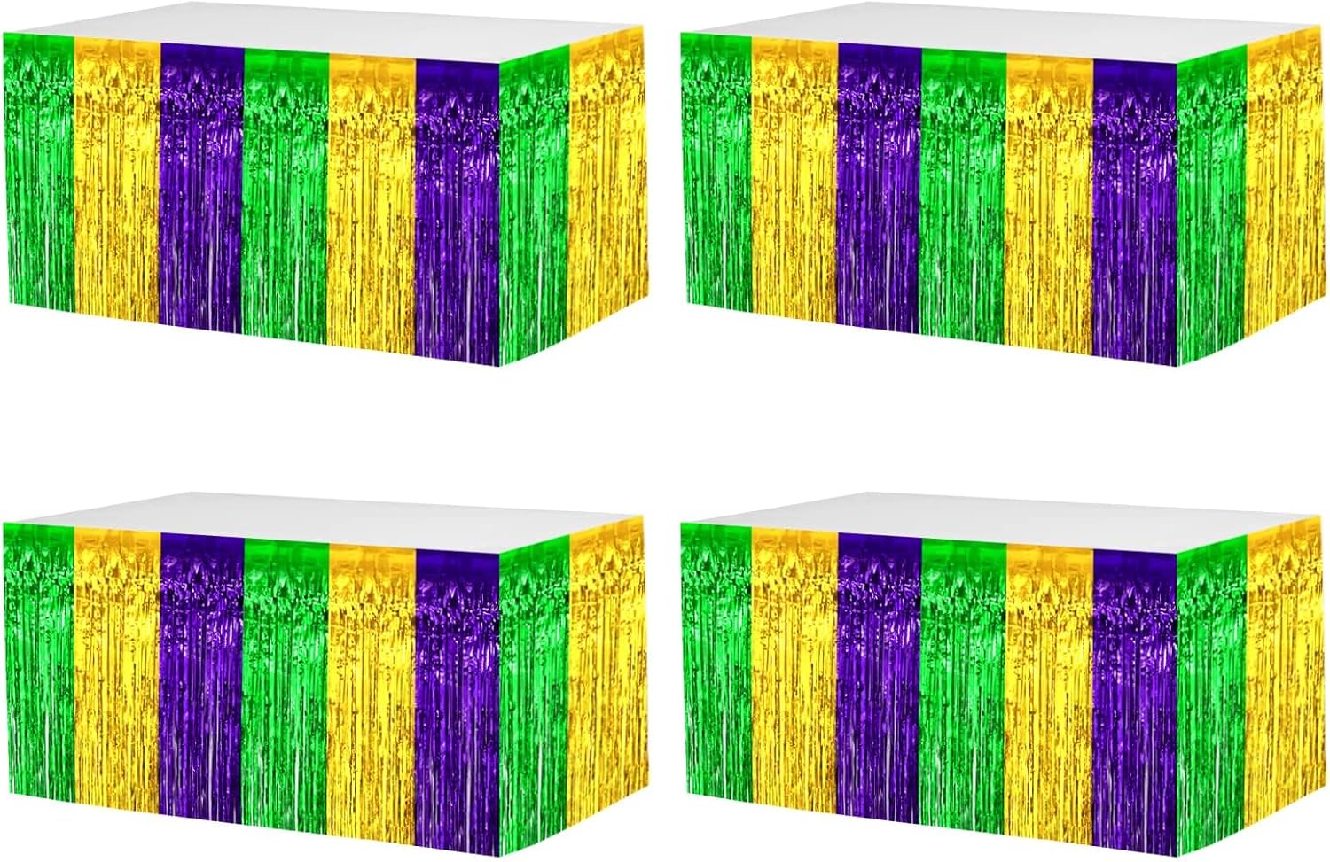 4 Pack 29x108 Inch Mardi Gras Metallic Foil Fringe Tinsel Table Skirts for Rectangle Tables Streamer for Christmas, Birthday, Parade Floats, Halloween Party Supplies(Gold Green Purple)