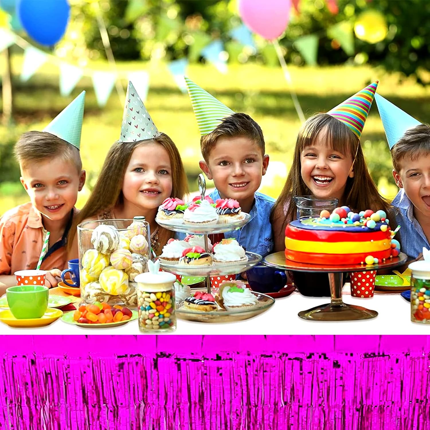 4 Pack 29x108 Inch Metallic Foil Fringe Tinsel Table Skirts for Rectangle Tables Streamer Curtains Backdrop for Christmas, Birthday, Parade Floats, Halloween Day Party Supplies(Fuchsia)