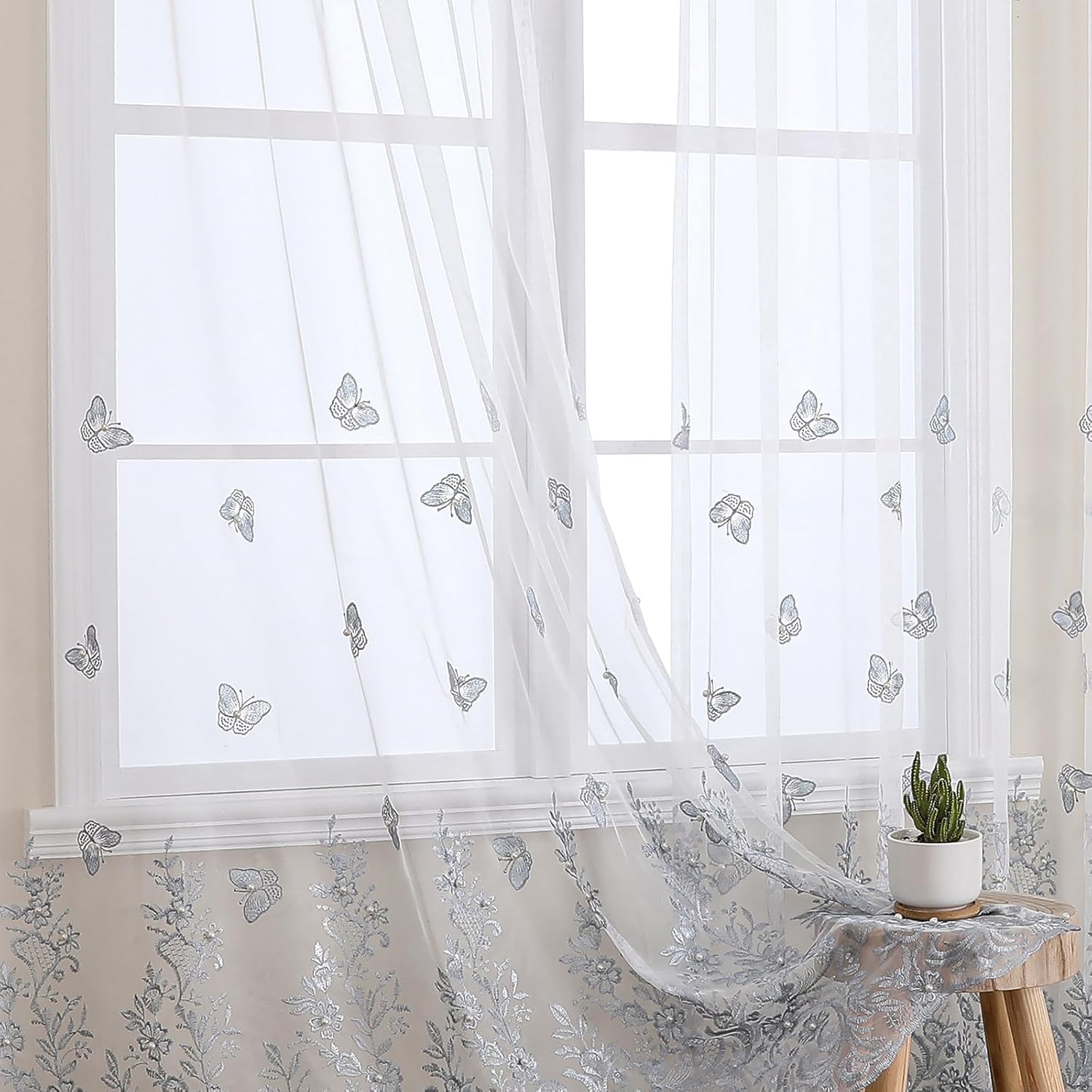 VISIONTEX White Sheer Voile Curtains, Decorative Blue Embossed Butterflies Rod Pocket Window Drapes for Home Kitchen, Living Room and Bedroom 54 x 84 Inch, Set of 2 Curtain Panels