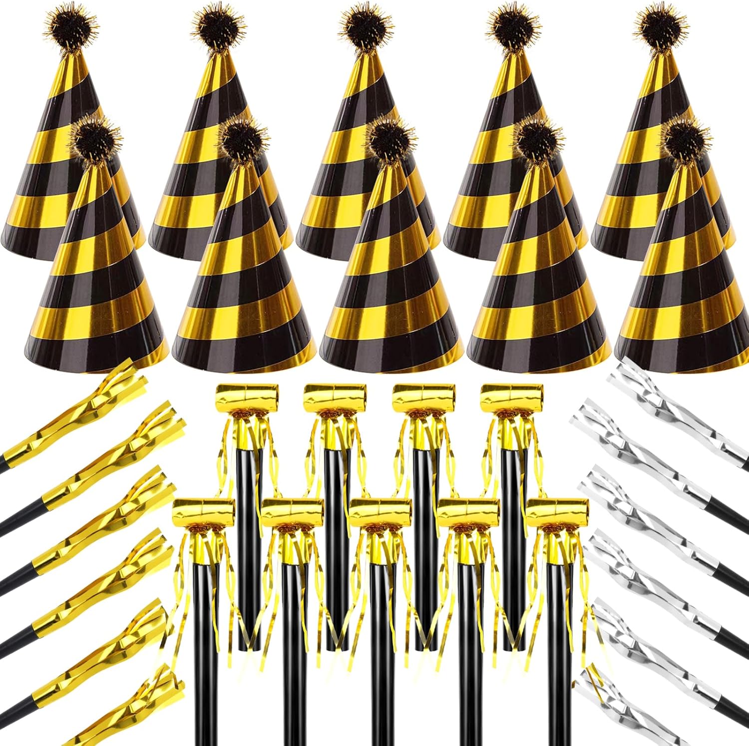 34 Pcs Birthday Party Hats - Gold Cone Hats Including 12 Paper Hats and 22 Noise Makers