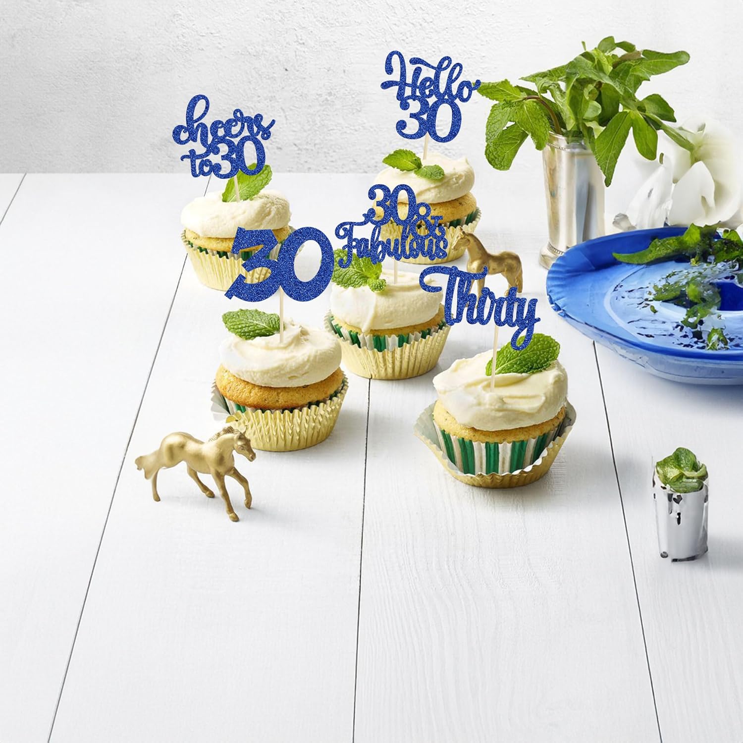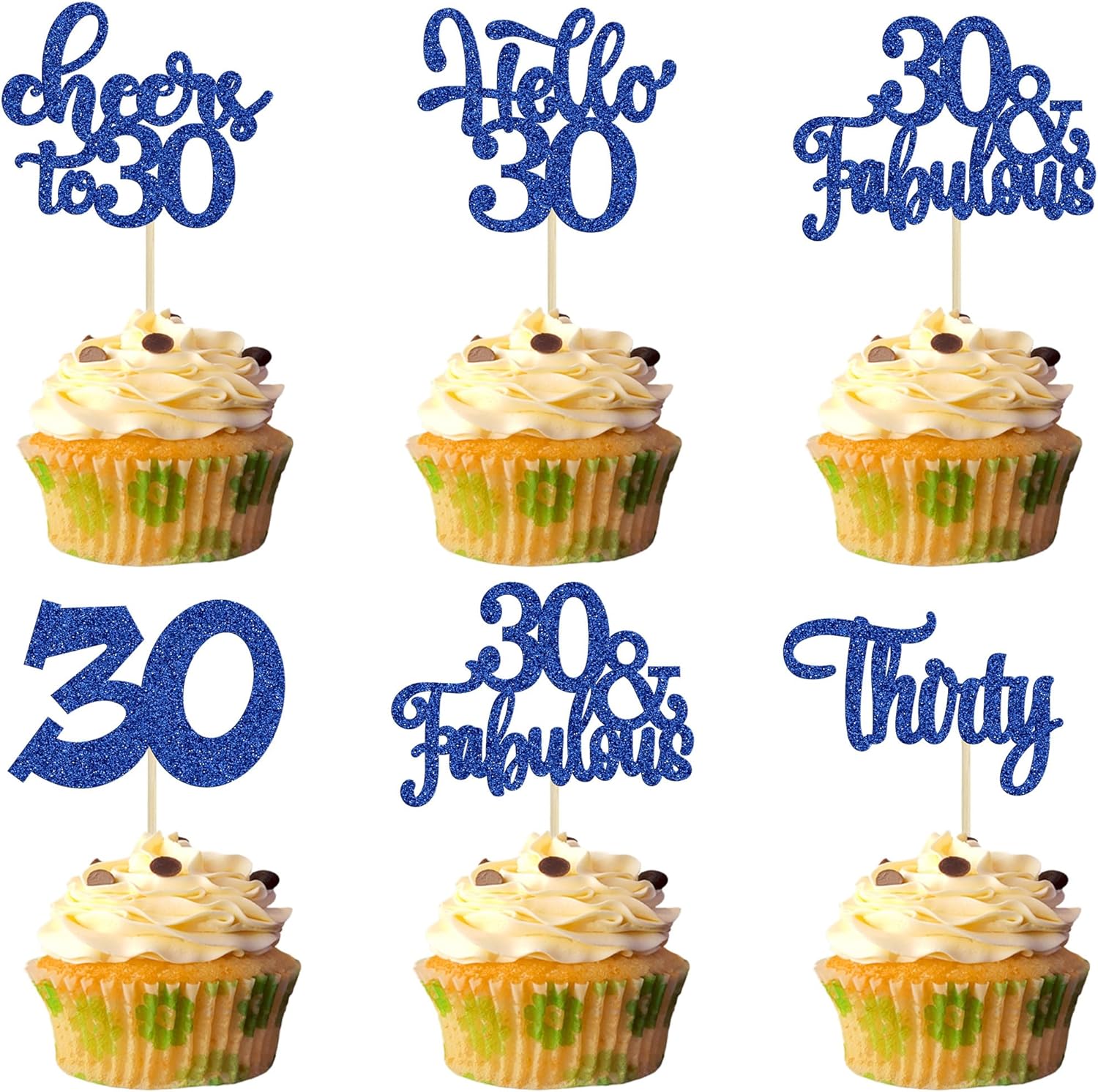 30Pcs Happy 30th Birthday Cupcake Toppers Deep Blue Glitter Thirty Cheers to 30 Birthday Cupcake Picks for Happy 30th Birthday Anniversary Party Cake Decorations Supplies