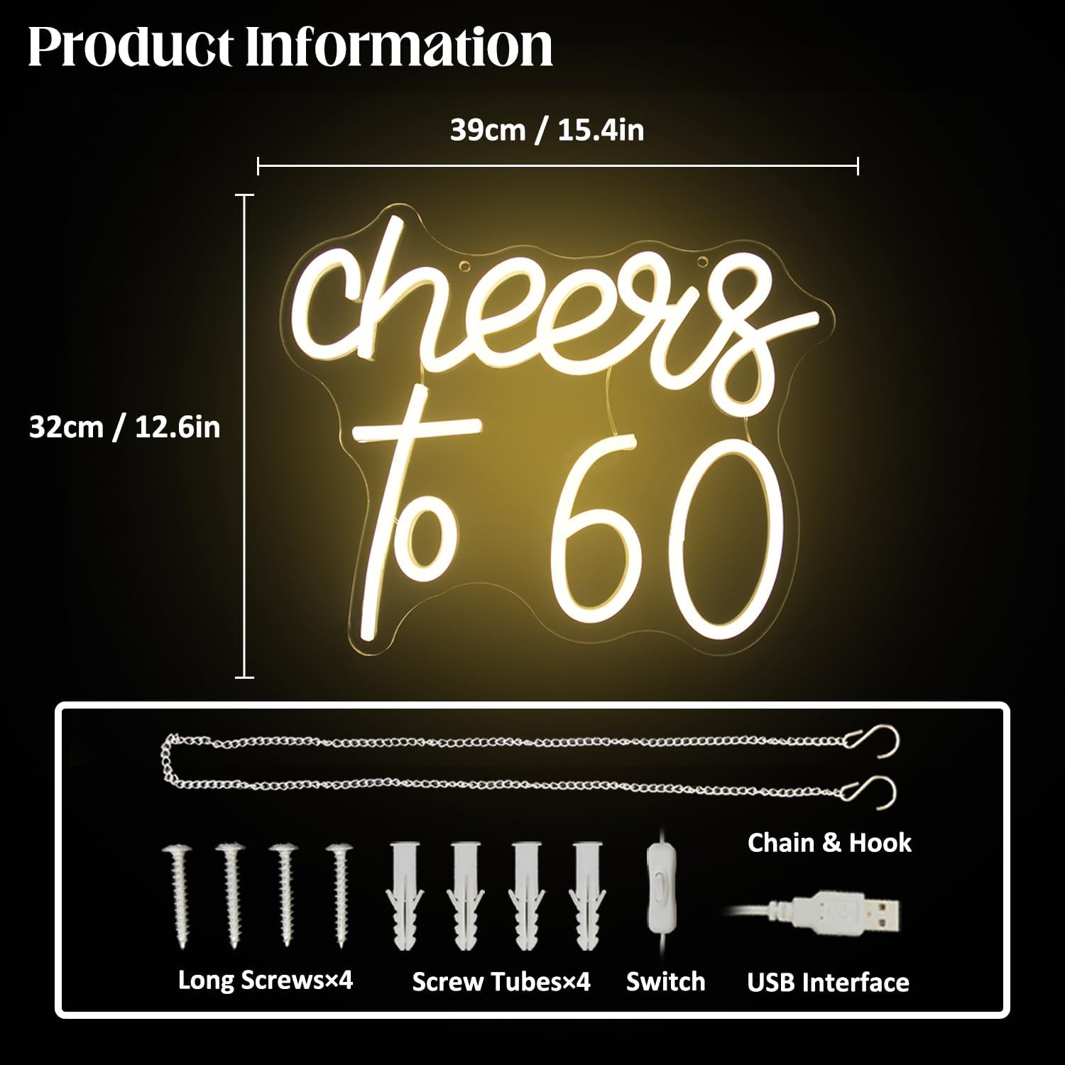 - Happy 60th Decor: Cheers to 60 years neon light up sign is perfect to make a great addition to the 60th anniversary theme or to happy 60th birthday decorations. It is also suitable as a gift for your lover or friend.