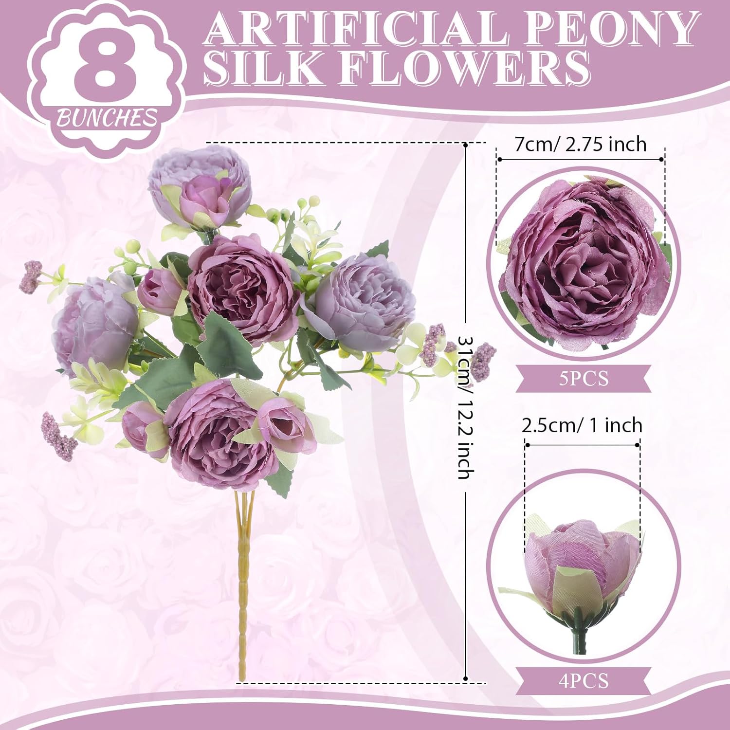 8 Bundles Artificial Peonies Flowers Boho Faux Flowers Arrangements Artificial Centerpiece Spring Bouquet Floral Wedding Decoration for Vase(Purple)