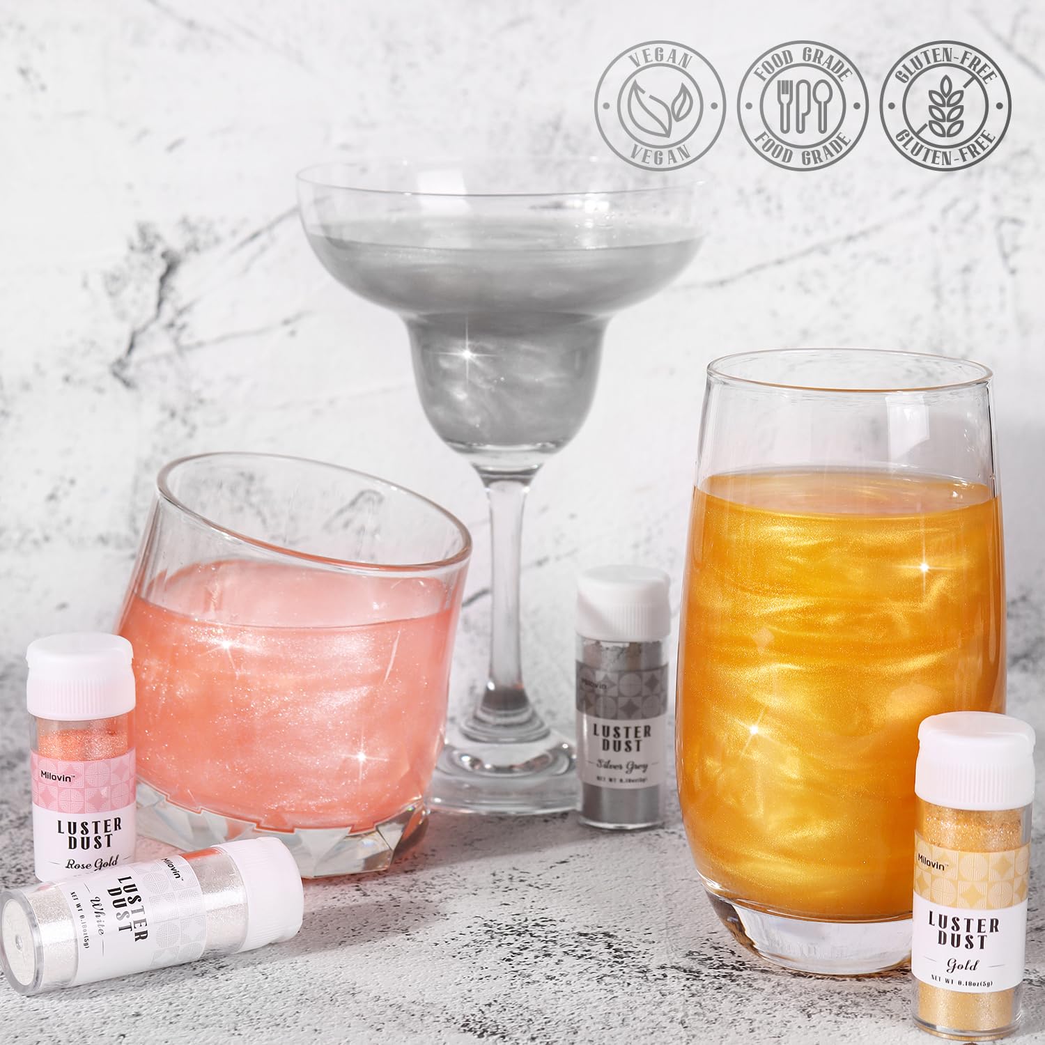 - Edible Glitter for Cocktails: Edible glitter set including gold edible glitter, rose gold glitter, white edible glitter, and silver edible glitter. Made of food-grade mica powder and food coloring. Odorless, Tasteless, Vegan, nut-free, gluten-free
