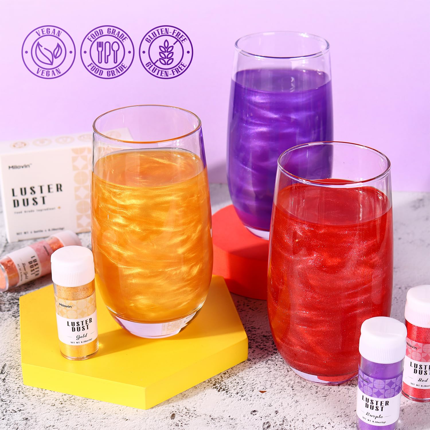 - Edible Glitter for Cocktails: Including gold edible glitter, rose gold glitter, purple edible glitter, and red edible glitter. Made of food-grade mica powder and food coloring. Odorless, Tasteless, Vegan, nut-free, gluten-free