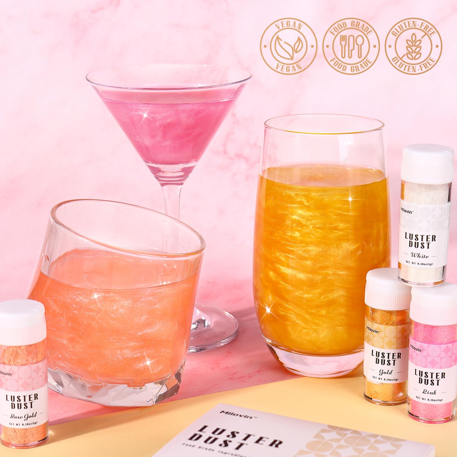 - Wide Application: Luster dust edible is perfect for cakes, cupcakes, macarons, cookies, pop cakes, and strawberries. Also can have a shimmering effect in vodka, cocktails, drinks, and champagnes. It makes the food add a magical color and more vivid, and it doesn't affect the texture