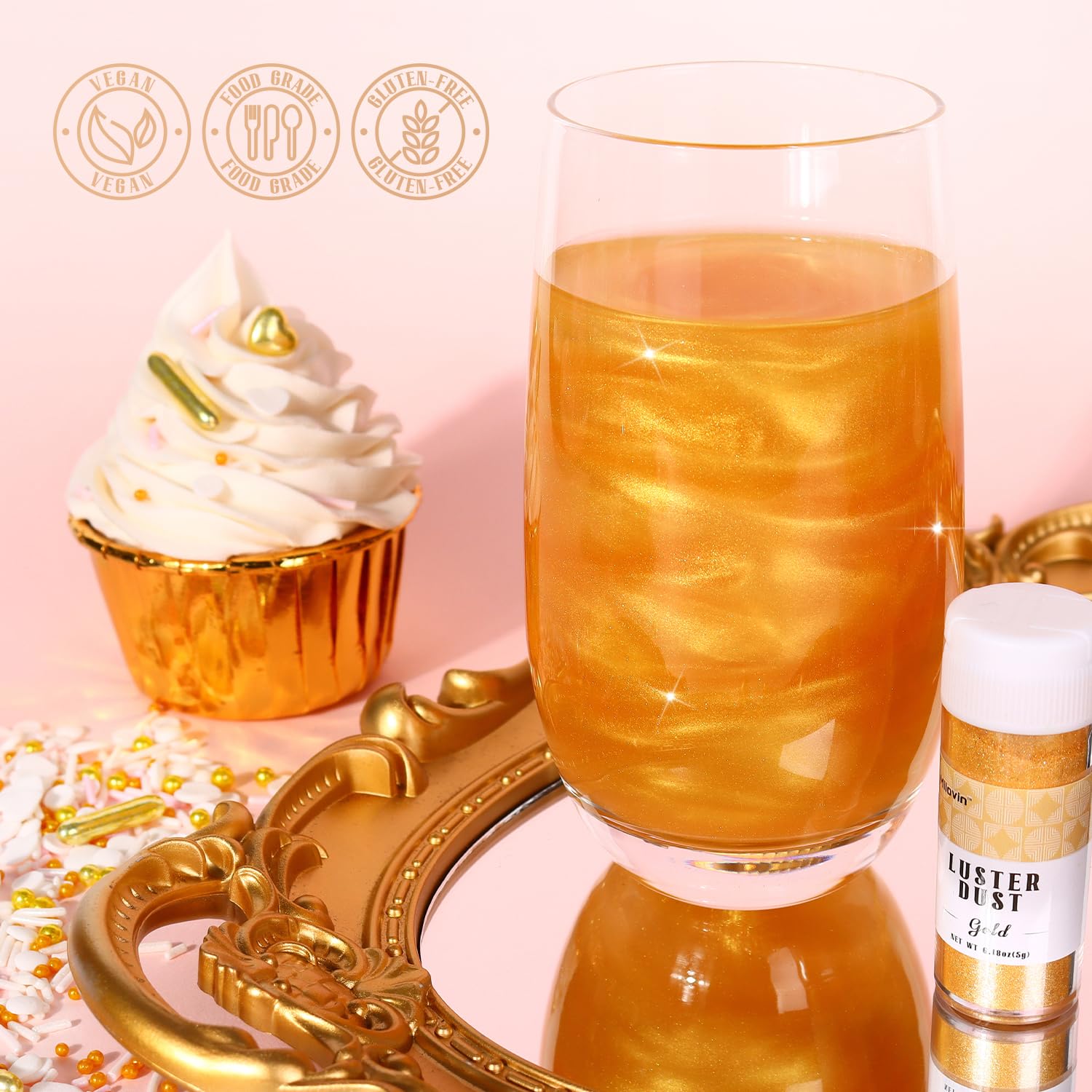 - Gold Luster Dust Edible: Made of food-grade mica powder and food coloring, odorless, and tasteless. It makes the food add a magical color and more vivid, and it doesn't affect the texture! Vegan, nut-free, gluten-free, adults or kids can be safe to use