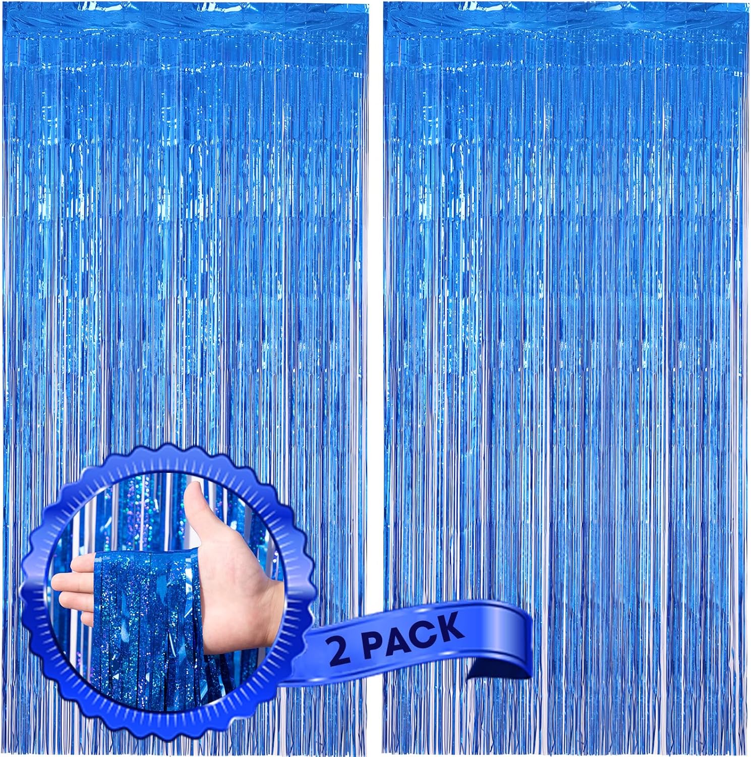 2 Pack Laser Blue Foil Fringe Backdrop Curtains, Tinsel Streamers Birthday Party Decorations, Fringe Backdrop for Graduation, Baby Shower, Gender Reveal, Disco Party