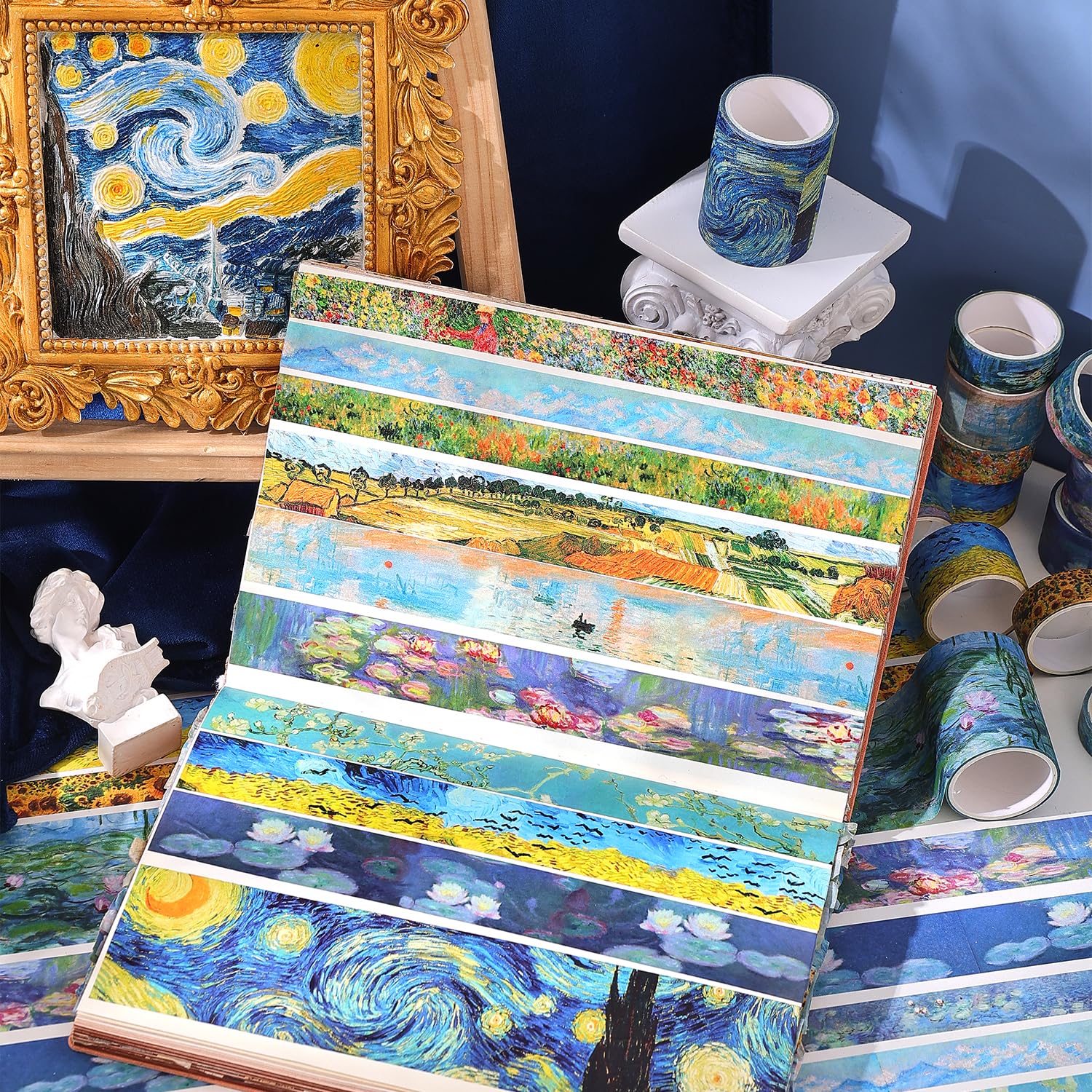 - [32 Rolls Van Gogh & Blue designs] 32 Rolls Washi Tape, 0.31 inch(8mm)wide x 6 Rolls, 0.39 inch(10mm) x 6 Rolls, 0.59 inch(15mm)wide x 12 Rolls, 0.98 inch(25mm) x 6 Rolls, 1.97 inch(50mm) x 2 Rolls, each roll is 3m. 32 different patterns, this oil painting washi tape adds color and vitality to the pasted items, making daily life more interesting.