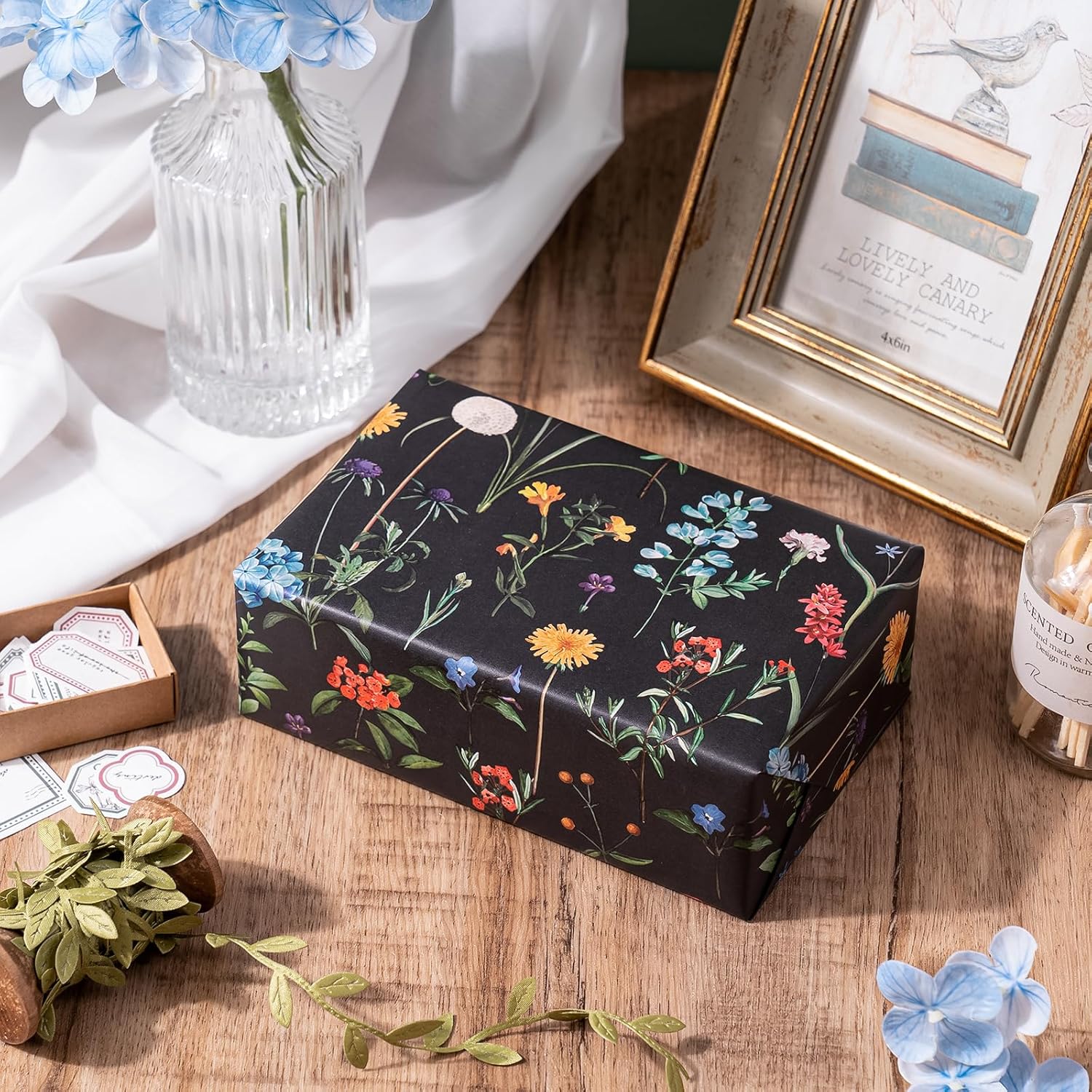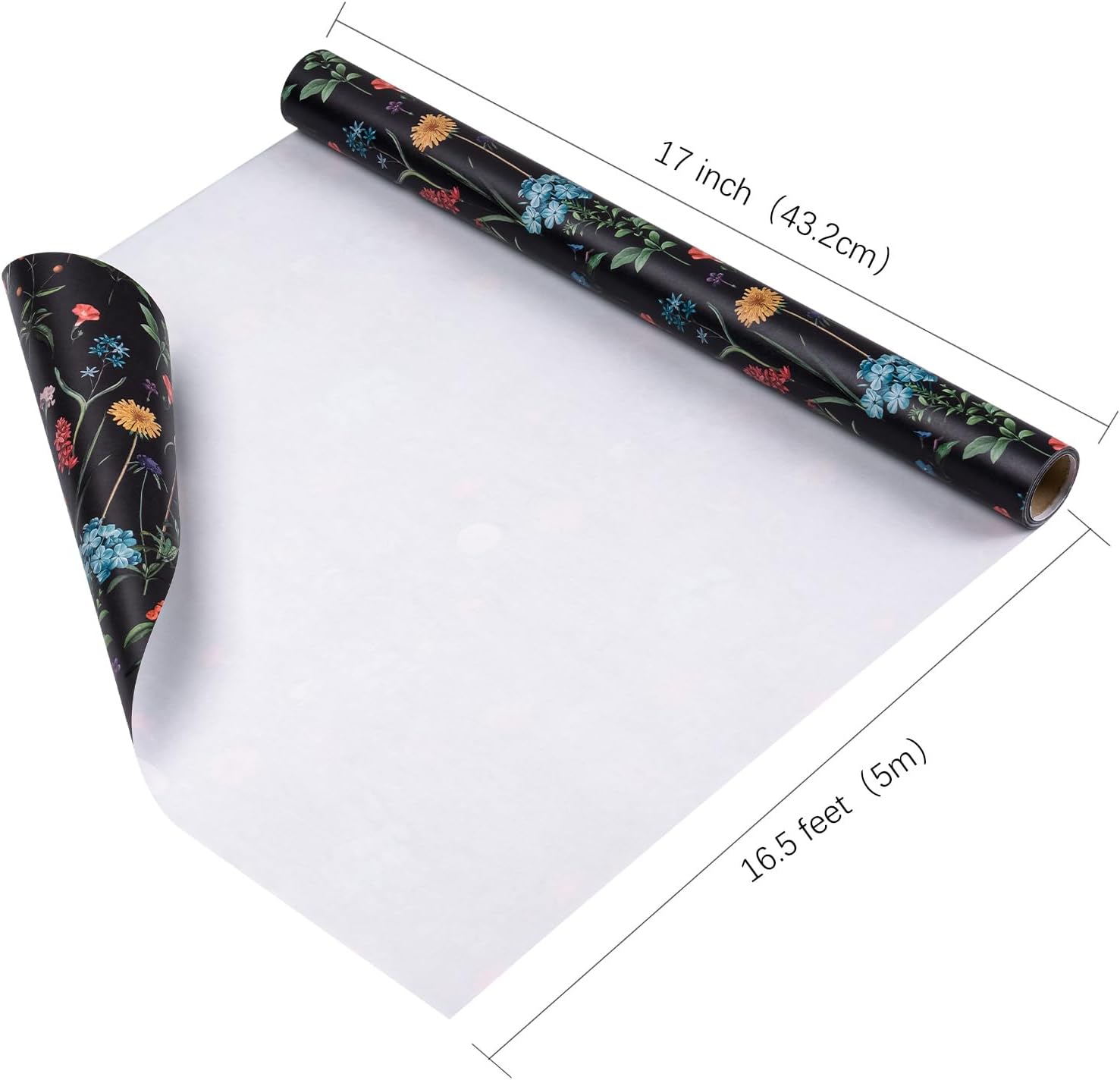 WRAPAHOLIC Kraft Wildflower Wrapping Paper - Mini Roll - 17 Inch x 16.5 Feet - Black Floral Wrapping Paper for Wedding, Birthday, Wedding, Bridal Shower, Drawer Liners, Tea Party