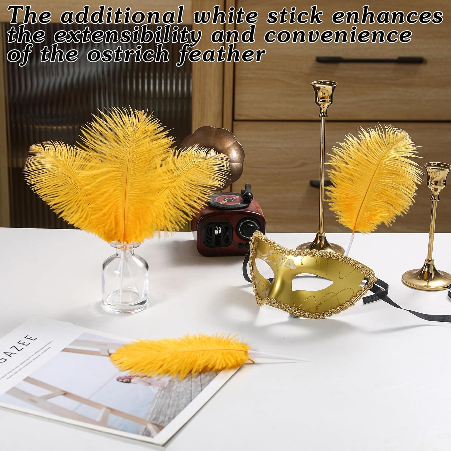 - Creative Ostrich Feathers Set: 30 pcs gold ostrich feathers bulk 6-8 inches, 30 pcs small white sticks 3 inches long. Ostrich feathers kit total length can be up to 9-11 inches
