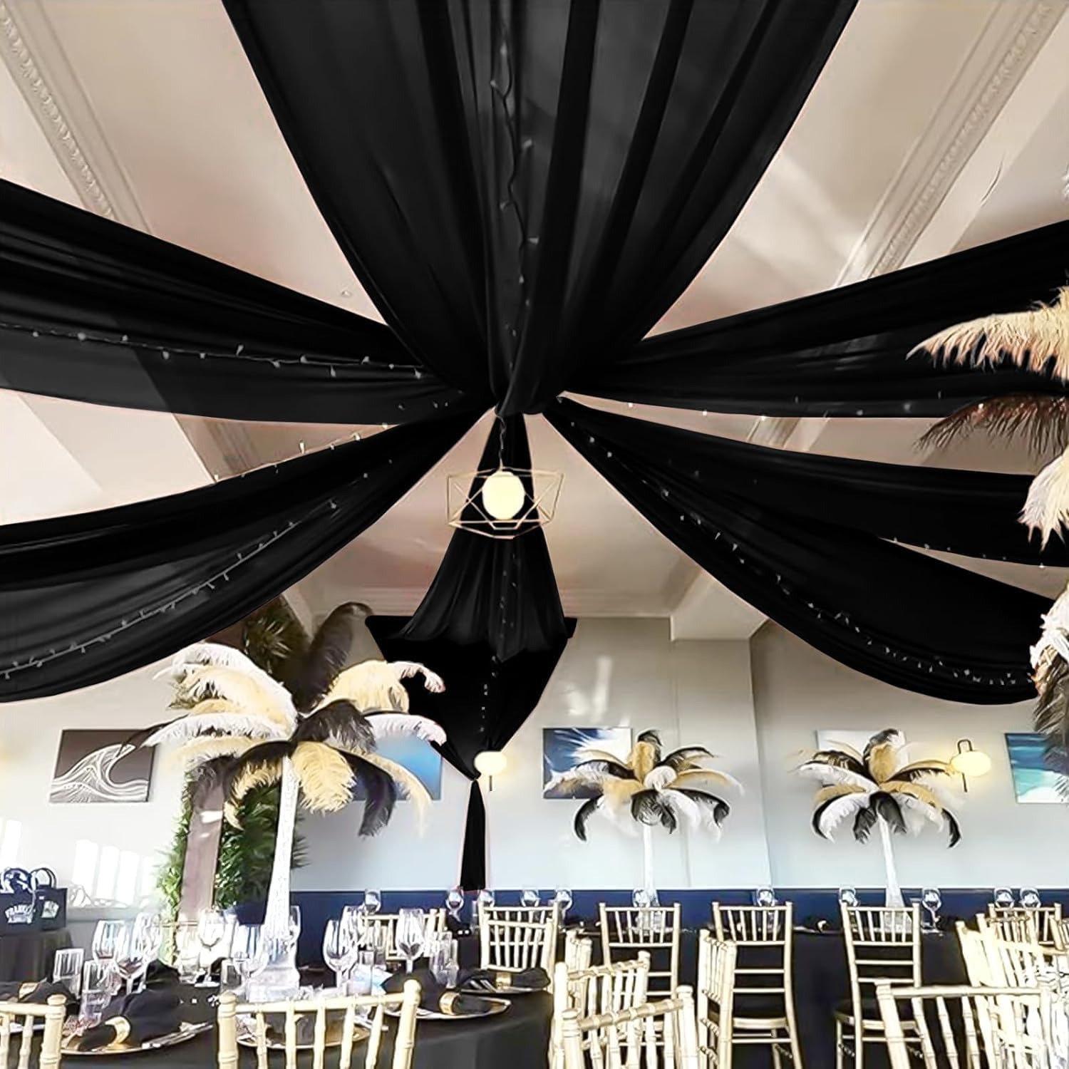 - đ·ăSoft Sheer MaterialăLong wedding ceiling drapes is made of soft touch chiffon fabric. All edges are finished with firm and exquisite stitching, airy and light-weighted. Wrinkle-free, easy draping or hanging straight, good vertical sense and durable. It will help to create a great eye catching detail in your wedding ceiling decoration.