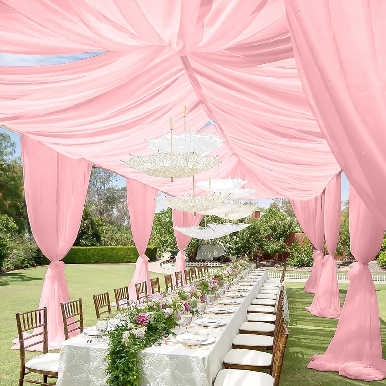 - đ·ăSoft Sheer MaterialăLong wedding drapes is made of soft touch chiffon fabric. All edges are finished with firm and exquisite stitching, airy and light-weighted. Wrinkle-free, easy draping or hanging straight, good vertical sense and durable. These backdrop curtains will help to create a great eye catching detail in your wedding ceiling decoration.