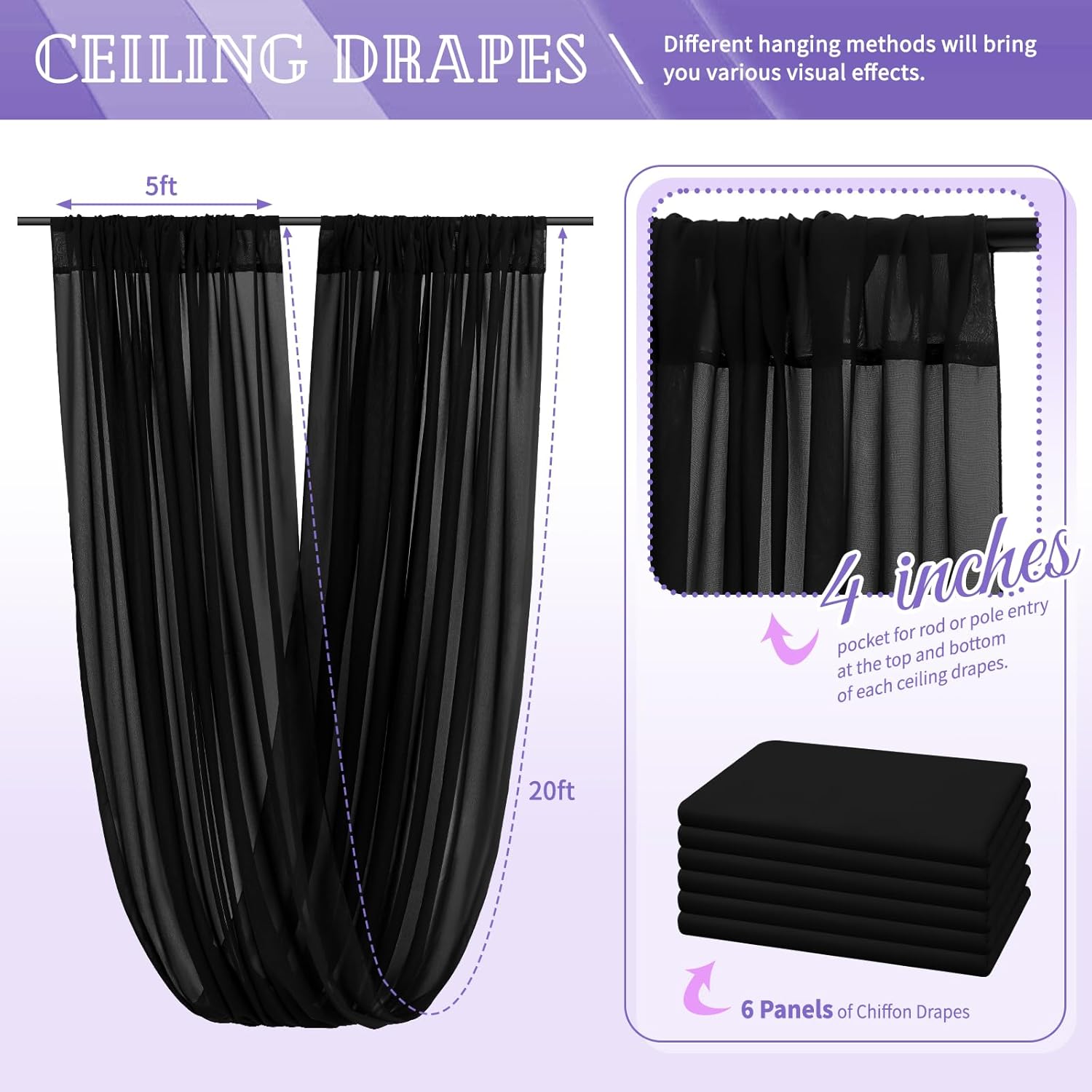 - 【Chiffon Fabric Curtain】The package will include 6 panels black wedding ceiling drapes (Not include stand), each wedding extra long curtain measures 5 feet(60inch)wide x20 feet(240inch) long. Sufficient quantity can meet your needs. These arch draping are applicable for any indoor and outdoor occasion either for decorative or functional uses.