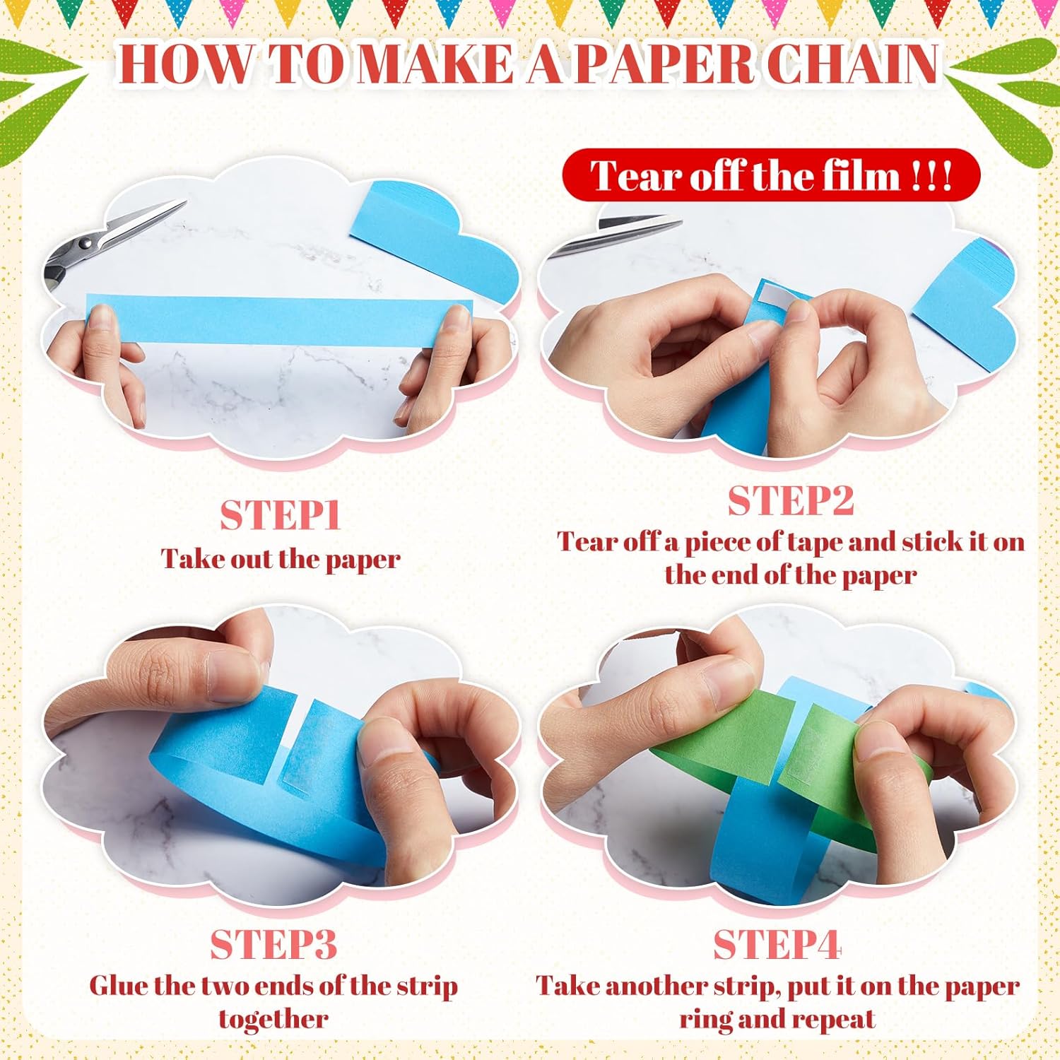 - Worry Less Crafting Experience: crafting has never been easier with our DIY paper chain strips that equipped with sticky tape; You just need to stick the 2 ends of the paper together with the tape, match the color as you like, ring by ring, and you will get an exquisite handicraft, without complex or dangerous procedures; You can quickly turn your ideas into reality without the stress of sourcing for additional crafting materials