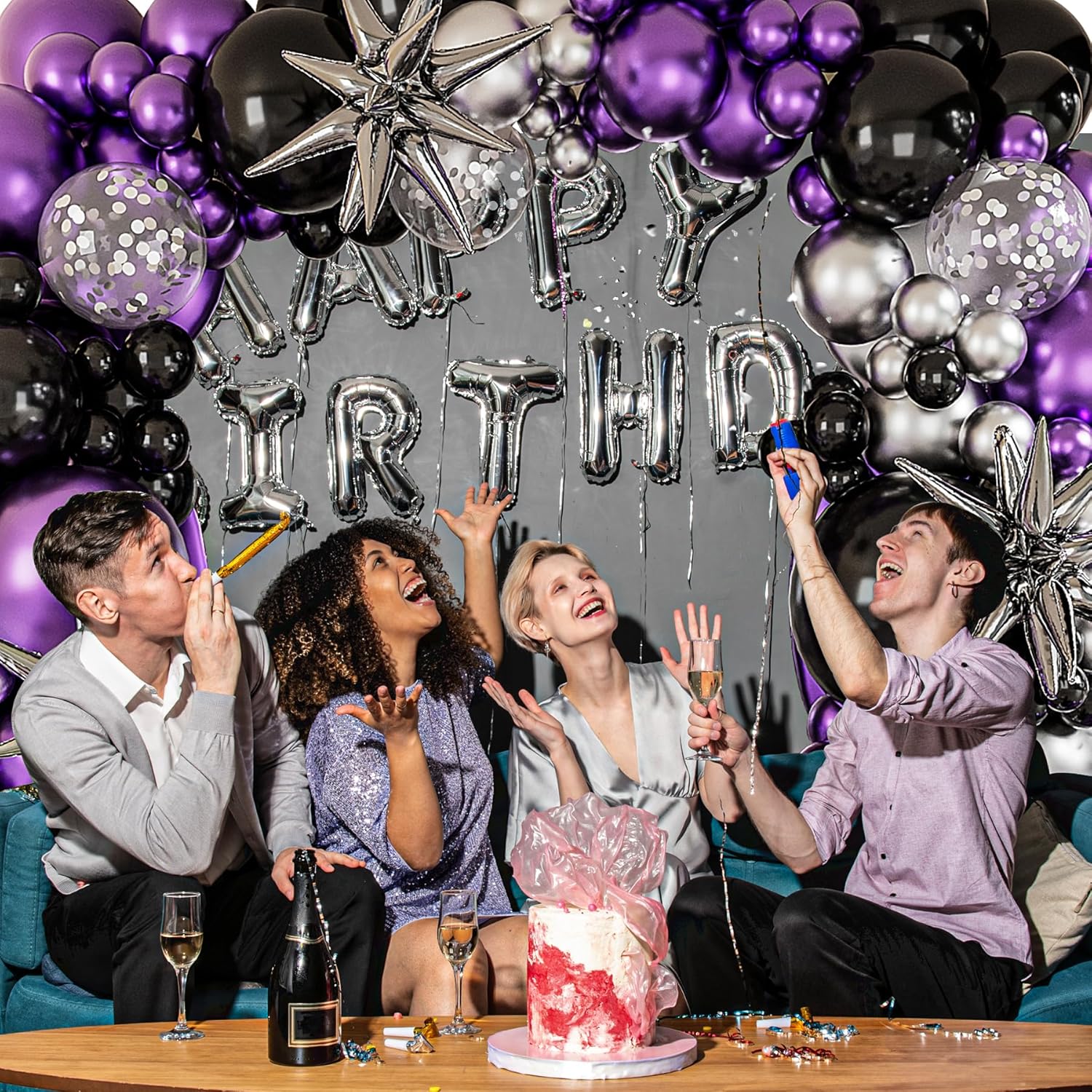 - [PACKAGE SPECIFICATION]127Pcs balloon arch kit includes silver starburst balloons(22in3pcs)+metallic purple balloons(18in2pcs+10in30pcs+5in15pcs)+black balloons(18in1+10in25pcs+5in15pcs)+metallic silver balloons(18in1pcs+10in15pcs+5in15pcs)+silver confetti balloons(12in5pcs),balloon glue dot,balloon decorating strip.