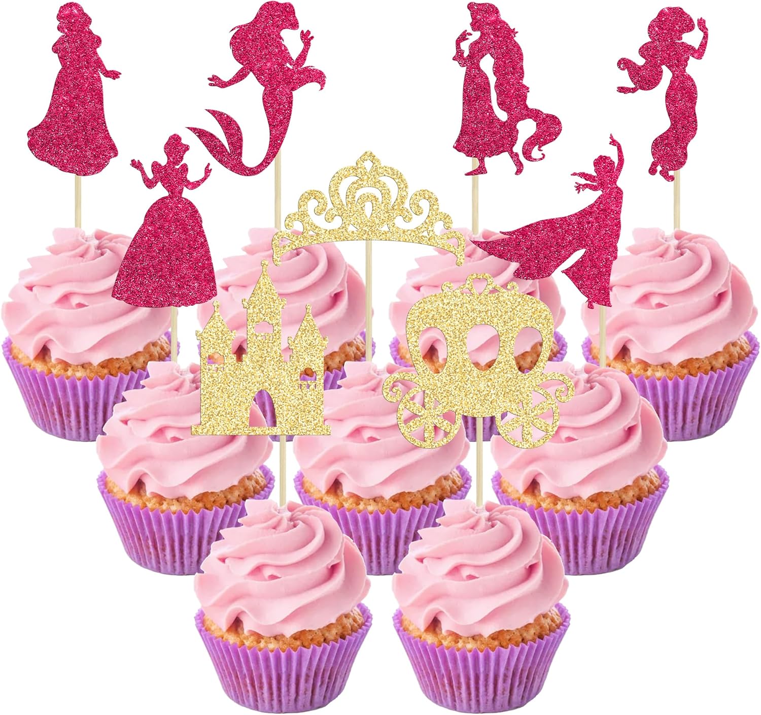 Gyufise 36Pcs Princess Cupcake Toppers Glitter Mermaid Girl Castle High Heel Crown Cupcake Picks Princess Theme Baby Shower Girls Birthday Party Cake Decorations Rose Red