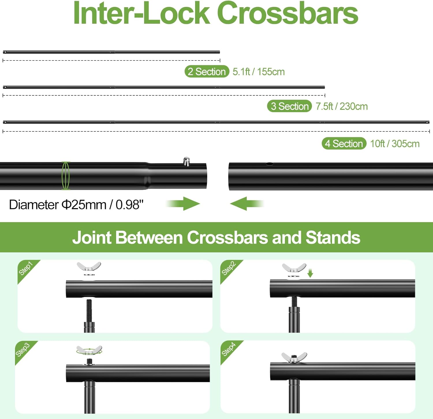 - 【Adjustable Height & Width】Backdrop stand adopts aluminum alloy construction, long-lasting and sturdy. Height and width adjustable with good flexibility, height can be adjusted from 2.9ft-10ft, interlocking crossbars width can be adjusted from 5.1ft to 10ft. Loading capacity up to 30lb. Easy to assemble and disassemble in just a few minutes.