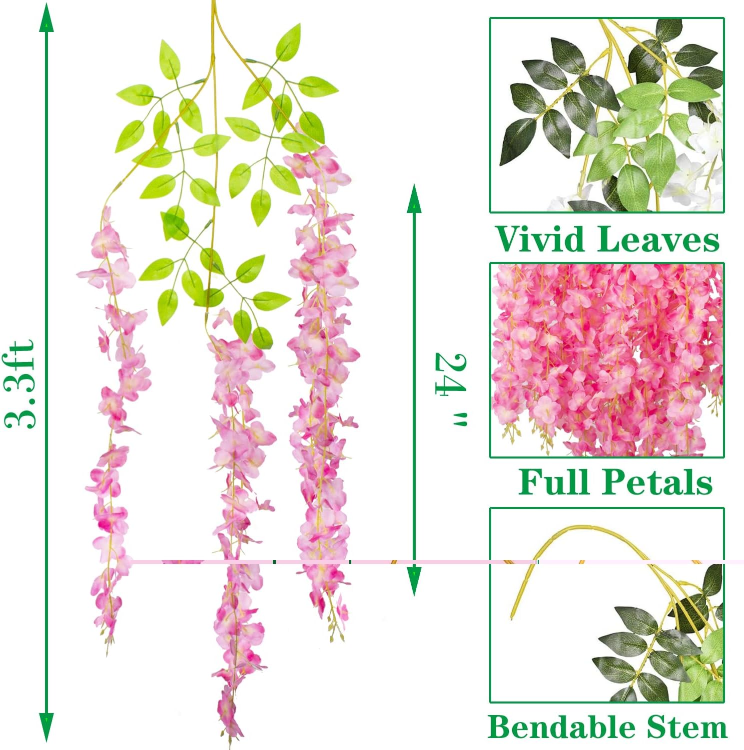 - 🌸Size: Each fake flower vine approx 3.75 Feet in length. Per artificial wisteria with 3 branches flower and 6 branches leaves. Full flowers and rich colors, making the decoration more layered.