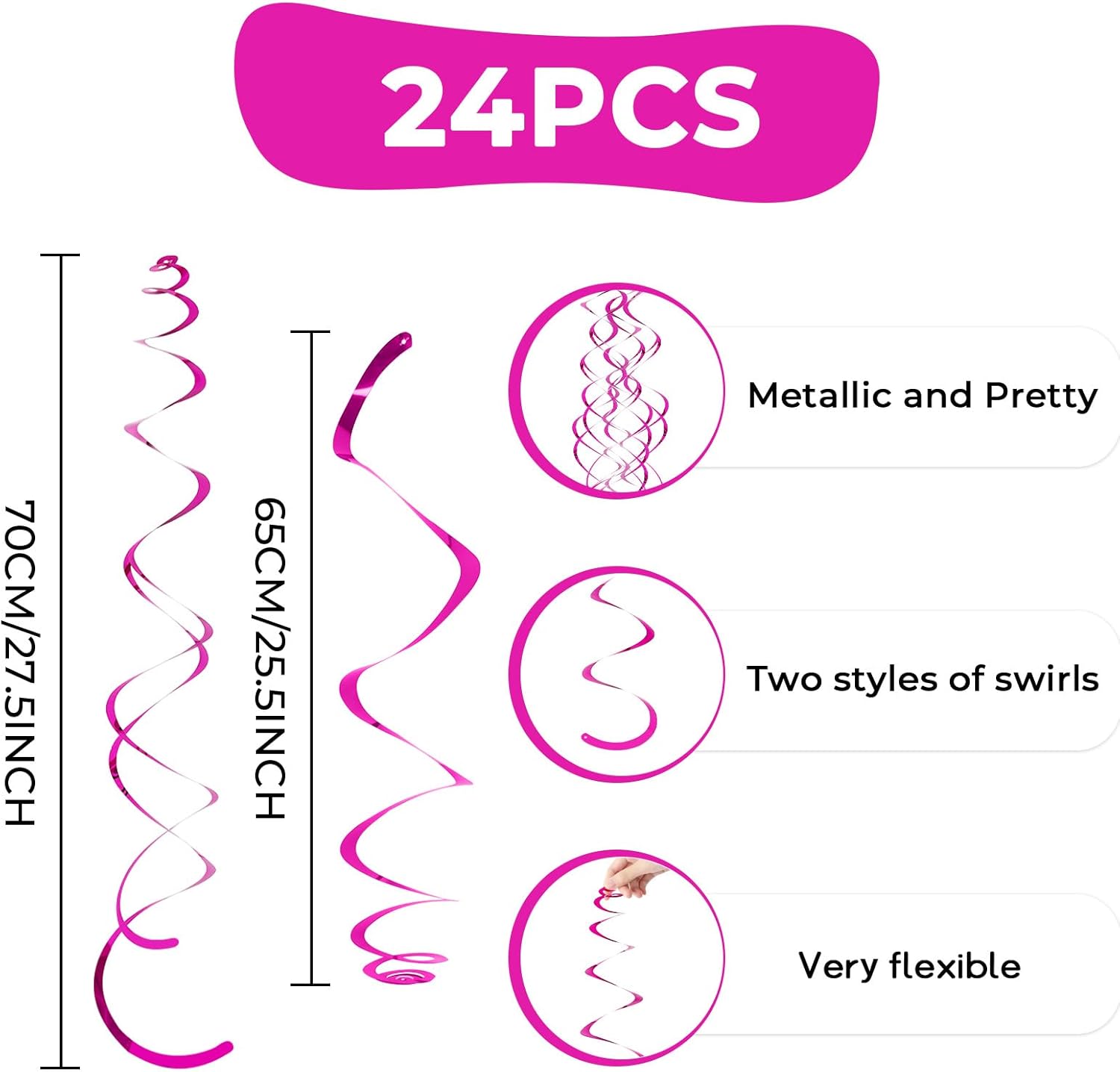 24 PCS Hot Pink Hanging Swirl, Fuschia Sparkle Ceiling Hanging Decorations, Plastic Streamer Party Decorations with Double-Swirls and Single-Swirls for Birthday Decorations, Summer, Hawaiian