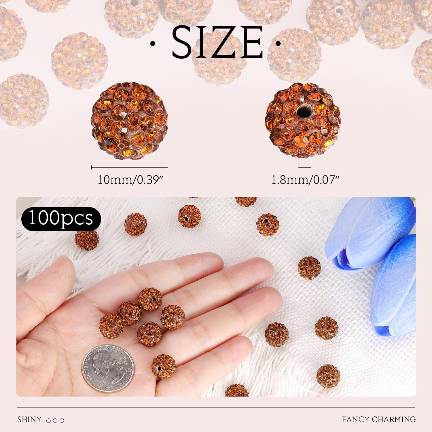 100 pcs 10mm Rhinestone Beads for Jewelry Making, Brown Shiny Round Shamballa Disco Beads Bulk, Sparkle Crystal Clay Christmas for Bracelet Baseball Necklace Earring Crafting and DIY