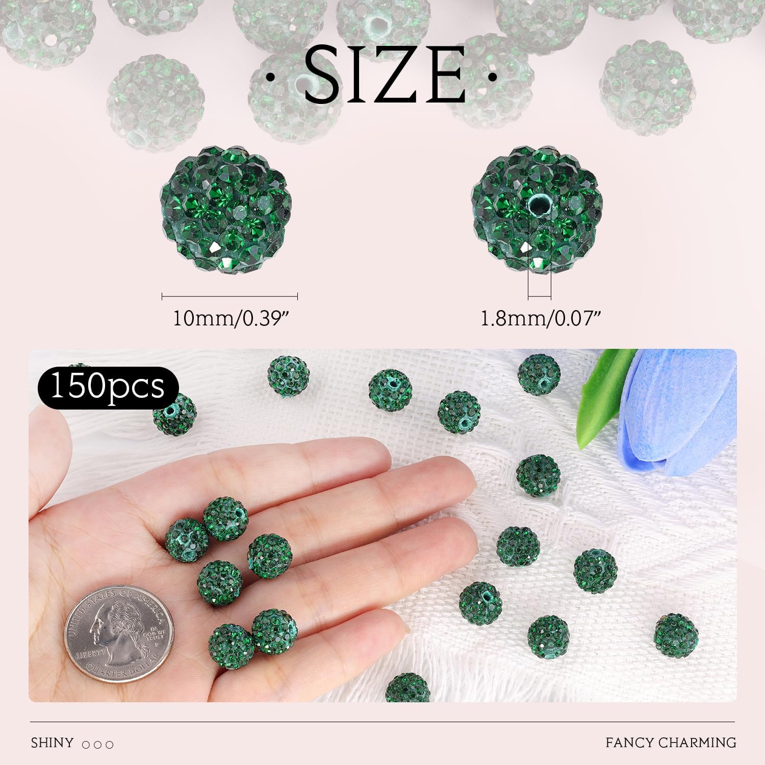 150 pcs 10mm Rhinestone Beads for Jewelry Making, Dark Green Shiny Round Shamballa Disco Beads Bulk, Sparkle Crystal Clay Christmas for Bracelet Baseball Necklace Earring Crafting and DIY